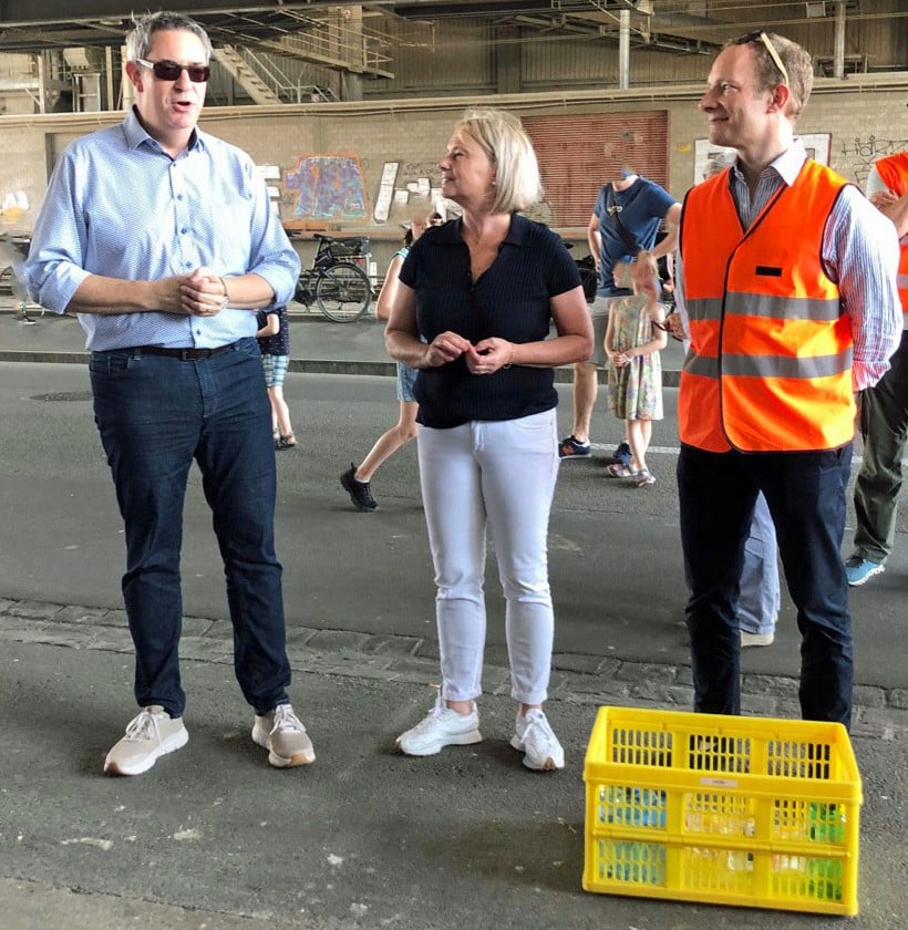 In ungezwungenem Rahmen begrüssen Martin Dätwyler (Direktor Handeslkammer beider Basel), Elisabeth Schneider-Schneiter (Präsidentin Handelskammer beider Basel) und Martin Haller (VR-Präsident Gateway Basel Nord AG) die Gäste der „Sonderfahrt“ mit dem „Haafebähnli“.