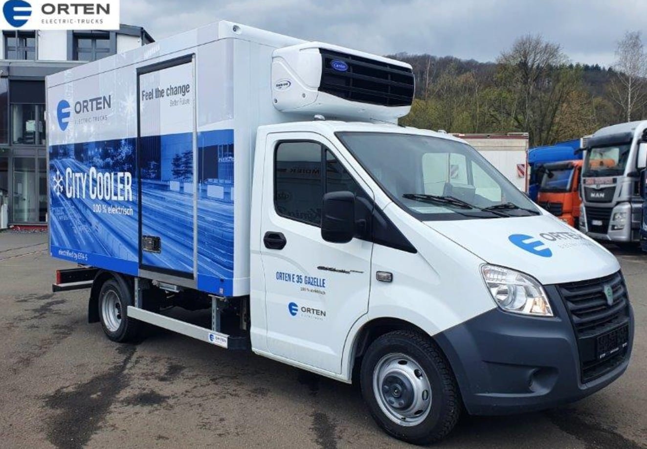 Die neue CityCooler E 46 Gazelle von ORTEN Electric-Trucks powered by EFAS. Die drei erfahrenen Partner ORTEN Electric-Trucks, Carrier und Kress sind beteiligt und herauskam ein leiser und sauberer, vollelektrischer Lieferwagen von Orten mit Kühlaufbau von Kress und Kühlaggregat von Carrier.