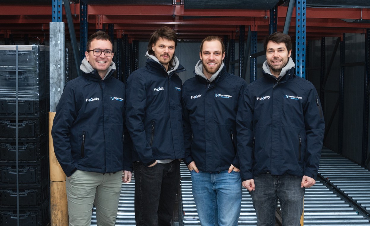 Foto: © Philipp Eigner/fleXality GmbH / Bildlegende: Das Gründungsteam der fleXality GmbH (v.l.n.r.): Sören Eilenberger (Geschäftsführer), Leon Pichotka (Lead Data Scientist), Dyke Wilke (Geschäftsführer) und Justus Hinken (Technischer Leiter, CTO)