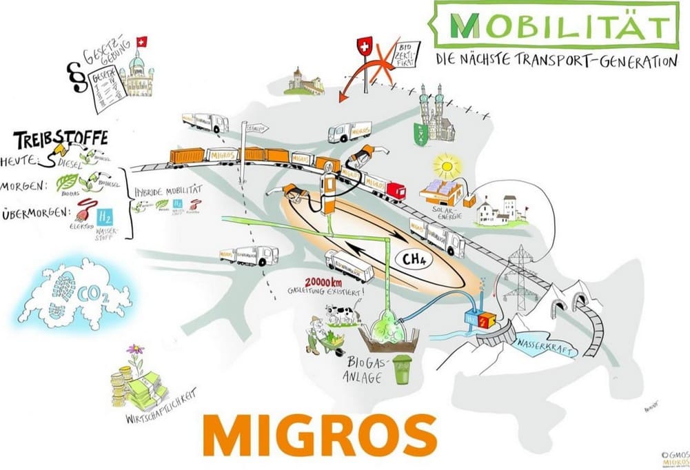 Das Unternehmen analysiert kontinuierlich Flottendaten. Dadurch gewinnt Migros Ostschweiz Erkenntnisse über die Auswirkungen unterschiedlicher alternativer Antriebsarten wie Biogas und Wasserstoff auf die Einsatzumgebung und -fähigkeit der Fahrzeuge. Dabei wird bei den unterschiedlichen Antriebsstoffen eine vermehrt auf eine regionale Herstellung gesetzt. So transformiert die Migros die Region Ostschweiz ganz nebenbei vom Importeur zum Produzenten von Antriebs- und Brennstoffen.
