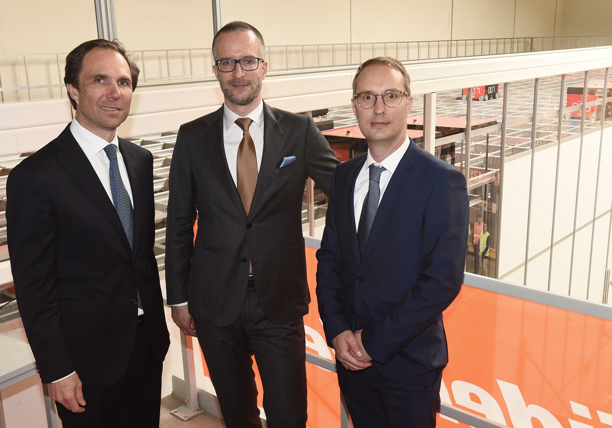 Vor dem neuen automatisierten Lager (v.l.): Wolfram Senger-Weiss, Vorsitzender der Geschäftsleitung, Balint Varga, Landesleiter Ungarn, und Thomas Schauer, Regionaleiter Zentral- und Südosteuropa (alle Gebrüder Weiss)