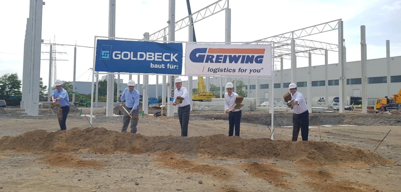 (Duisburg/Greven/Münster) Die Greiwing logistics for you GmbH erweitert erneut ihren Standort am Logport in Duisburg. Der Logistikdienstleister vertraut hierbei einmal mehr auf die Kompetenzen der Niederlassung Münster der GOLDBECK Nord GmbH als Generalunternehmer. Fünf Bauprojekte haben die Unternehmen bisher schon gemeinsam abgewickelt. Bei der aktuellen Maßnahme entsteht auf einer Fläche von 11.800 Quadratmetern auf dem Areal an der Hamburger Straße ein 5.000 Quadratmeter großes Logistikcenter mit 12.300 zusätzlichen Palettenstellplätzen in Verschieberegalen und 15 Hochsilos für die Lagerung sowie Abfüllung von rieselfähigen Gütern. Damit verfügt Greiwing an dem Standort künftig über mehr als 80.000 Palettenstellplätze und 27 Silos. Der Neubau kostet rund 13 Millionen Euro und soll im Mai 2021 fertiggestellt werden. Am vergangenen Freitag fand der Spatenstich statt.