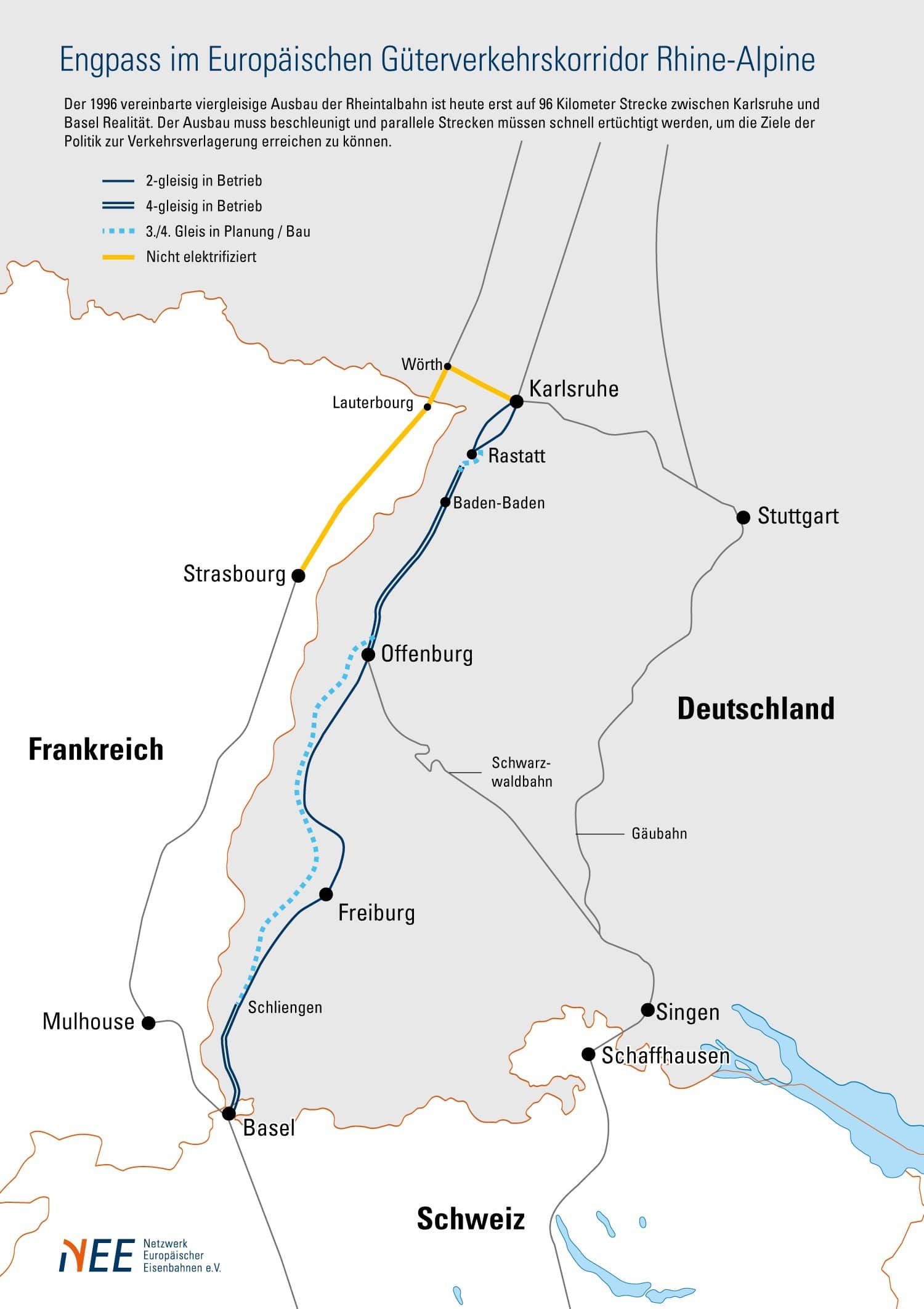 Erklärung zur Grafik: auf der Rheintalbahn sind die Abschnitte Karlsruhe-Rastatt und Offenburg-Schliengen mit Ausnahme eines kurzen Stücks in Freiburg nach wie vor nicht viergleisig. Die Strecke ist vollständig elektrifiziert, im Gegensatz zur Umleitungsstrecke Karlsruhe-Strasbourg-Basel, die im Abschnitt zwischen Wörth am Rhein und Lauterbourg nur eingleisig und bis Strasbourg auch nicht elektrifiziert ist. Wegen notwendiger Lokwechsel und unnötiger Sprachbarrieren bei den Infrastrukturbetreibern spielt die früher einmal bedeutende Strecke heute nicht einmal als Ausweichstrecke eine relevante Rolle. Im Osten des Rheintals ist die Umleitung von Zügen über die Gäubahn weithin nur eingleisig möglich und auch rund um Singen fehlt Infrastruktur. Als kontinuierliche Entlastung des Rheintals ist sie auch wegen der beschränkten Kapazitäten auf der Schweizer Seite im Knoten Zürich nicht nutzbar.