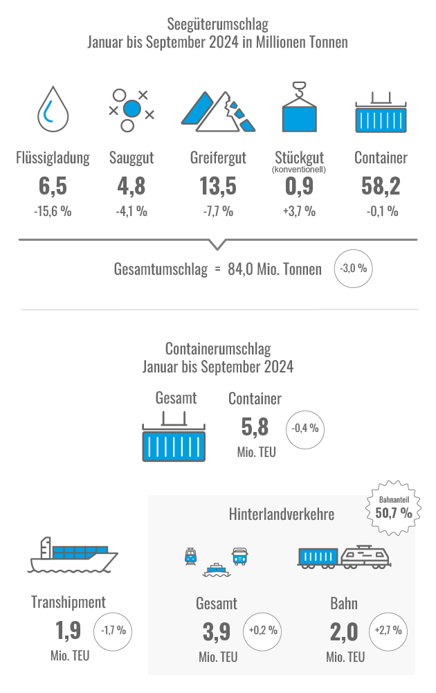 Trotz dieser Entwicklungen spiegelt sich die schwache deutsche Wirtschaft weiter im Gesamtumschlag des Hafens wider. Hinzu kommen die angespannten politischen Rahmenbedingungen mit dem Krieg in der Ukraine und den Angriffen der Huthi-Milizen im Roten Meer. So gab der gesamte Seegüterumschlag um 3,0 Prozent nach und lag im Zeitraum von Januar bis September 2024 bei 84,0 Millionen Tonnen.