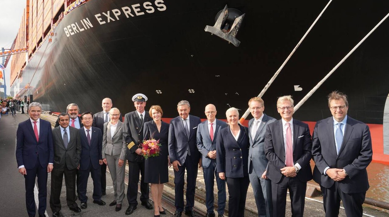 Hapag-Lloyd hat heute das erste Schiff seiner neuen Hamburg Express Klasse, die „Berlin Express“, offiziell in die Flotte aufgenommen. Im Beisein von rund 300 Gästen aus Wirtschaft und Politik vollzog Taufpatin Elke Büdenbender die feierliche Schiffstaufe am Containerterminal Burchardkai (Athabaskakai) im Hamburger Hafen. Zu den Gästen zählten Hamburgs Erster Bürgermeister Peter Tschentscher und Daniel Günther, Ministerpräsident von Schleswig-Holstein.