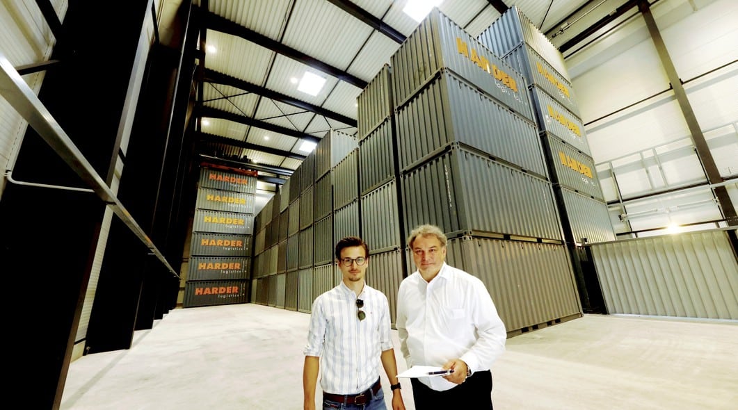 Foto: © Harder Logistics / Bildlegende: Johannes (links) und Marcello Danieli von Harder Logistics haben mit dem Containerlagerhaus flächensparend in die Höhe gebaut.