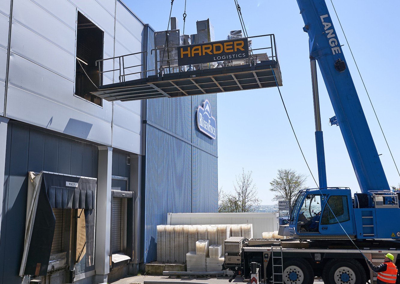 Nach der Fertigstellung der Verpackungshalle in Sassnitz, verlagerte HARDER logistics bei laufender Produktion über einen Zeitraum von sechs Monaten die dazugehörigen Verpackungslinien. Sechs der Anlagen demontierte das HARDER-Team am Hawesta-Standort in Lübeck und stellte diese in Zusammenarbeit mit den Herstellermonteuren in Sassnitz wieder betriebsbereit zur Verfügung. Zusätzlich wurden vier Verpackungslinien innerhalb des Rügener Werks verlagert. „Über sechs Monate fanden in Abstimmung mit der Produktion getaktet etwa 25 Hightech-Transporte zwischen den beiden Ostseestädten statt. Dabei kam unser eigener Fuhrpark, unsere Montageplattform sowie ein beauftragter 200-t-Kran zum Einsatz“, fasst Danieli zusammen. Mit der Kombination aus Kran und Montageplattform wurden die Anlagen teilweise über den unbefestigten Hof hinweggehoben und in die oberen Stockwerke transportiert. Der HARDER-Projektleiter ergänzt: „Alles, was über drei Tonnen wog, haben wir nicht über den Lastenaufzug, sondern über die Fassaden eingebracht.“