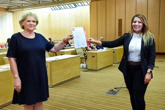 Foto: © Hellmann / Bildlegende: Karin Schrader, erste Bürgermeisterin von Bielefeld, überreicht die Auszeichnung an Loubna Gilani, Area Managerin, Hellmann Worldwide Logistics