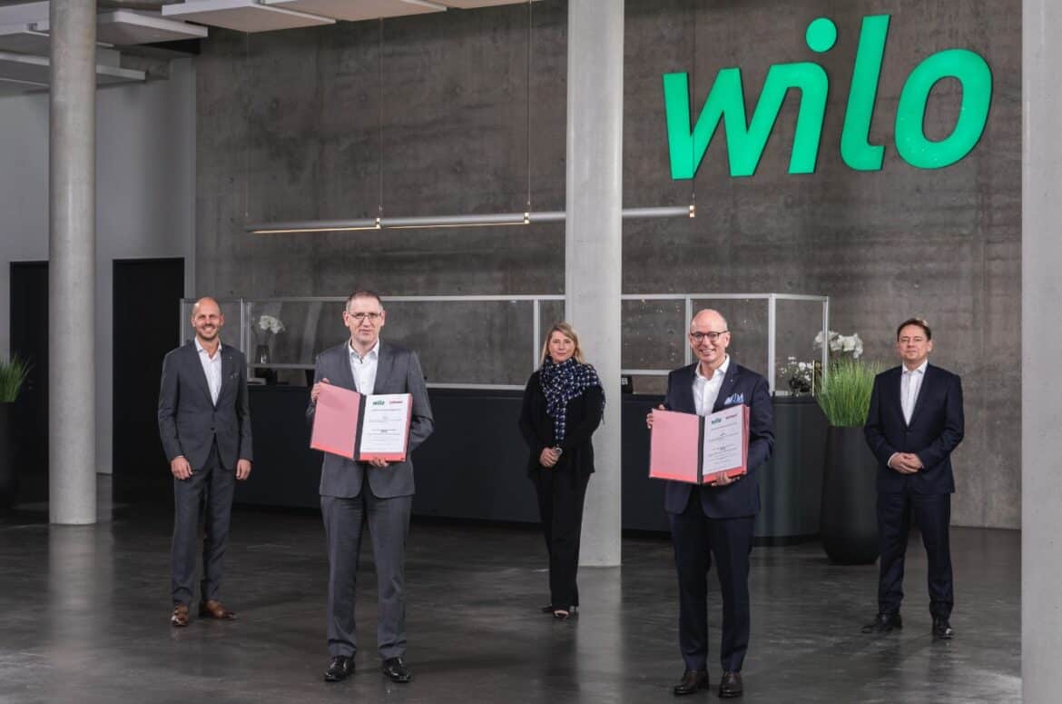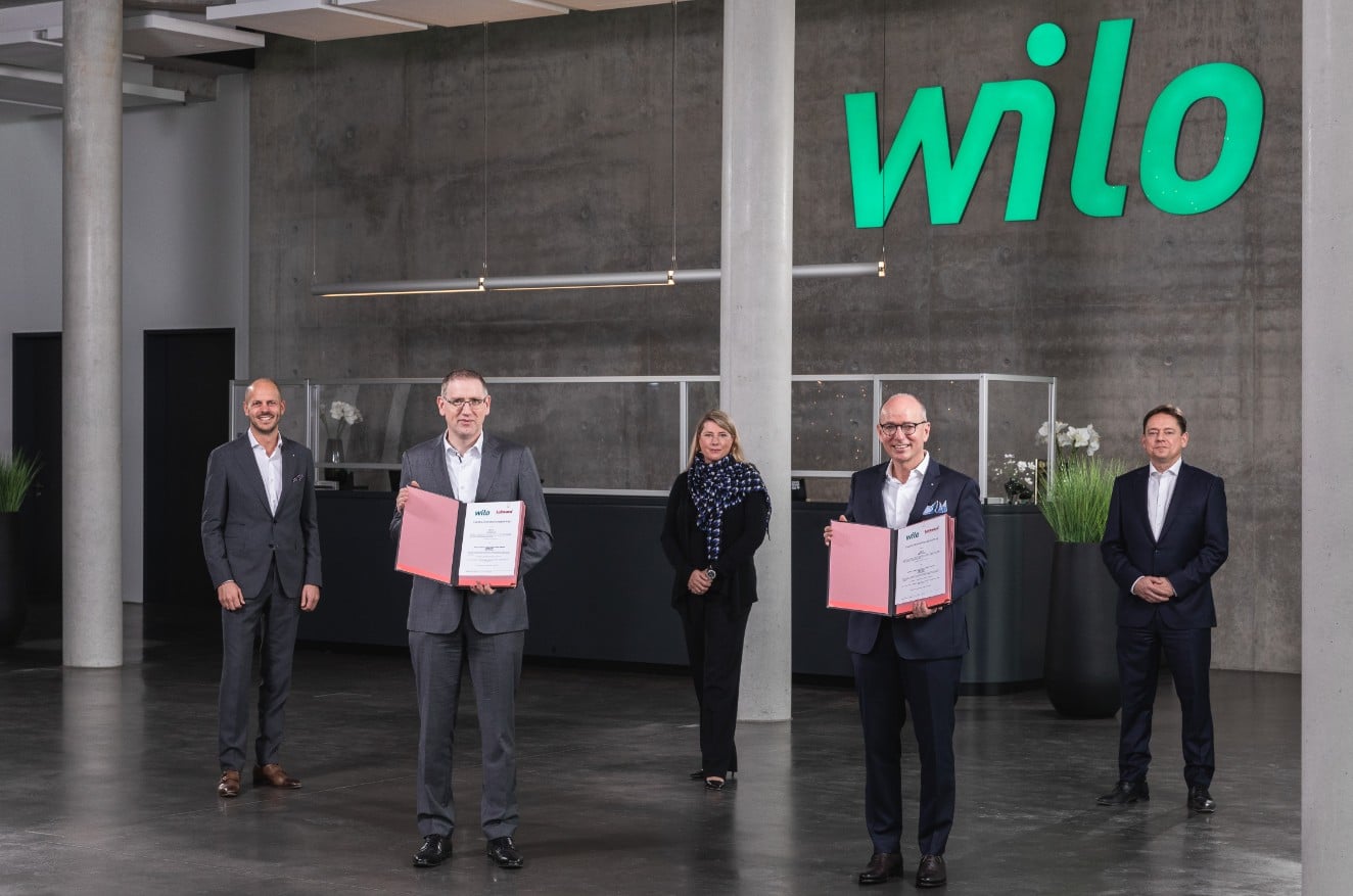 Foto: © Wilo / Bildlegende Titelbild: (v.l.n.r.) Sven Eisfeld, Managing Director Germany Hellmann Worldwide Logistics, Georg Weber, Chief Technology Officer WILO SE, Stefanie Hirschmann, Senior Vice President Group Procurement & Supply Chain Management WILO SE, Volker Sauerborn, Chief Operating Officer Hellmann Worldwide Logistics und Mathias Weyers, Chief Financial Officer WILO SE bei der Vertragsunterzeichnung auf dem Wilopark in Dortmund.