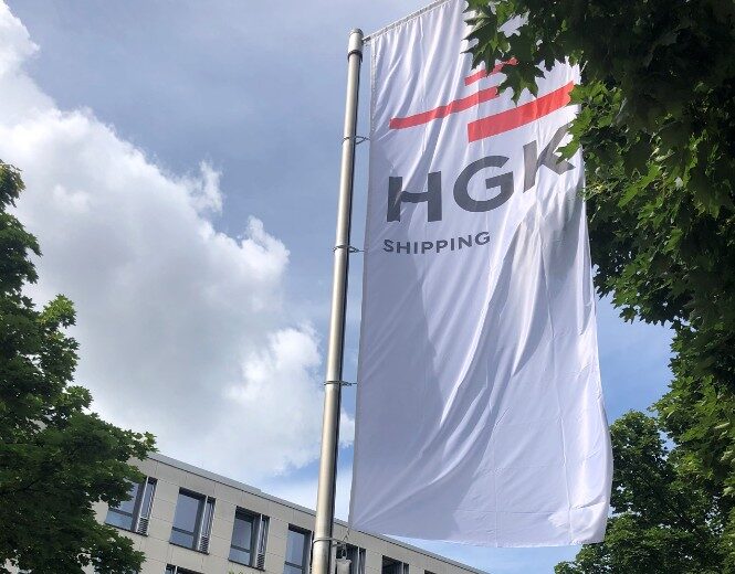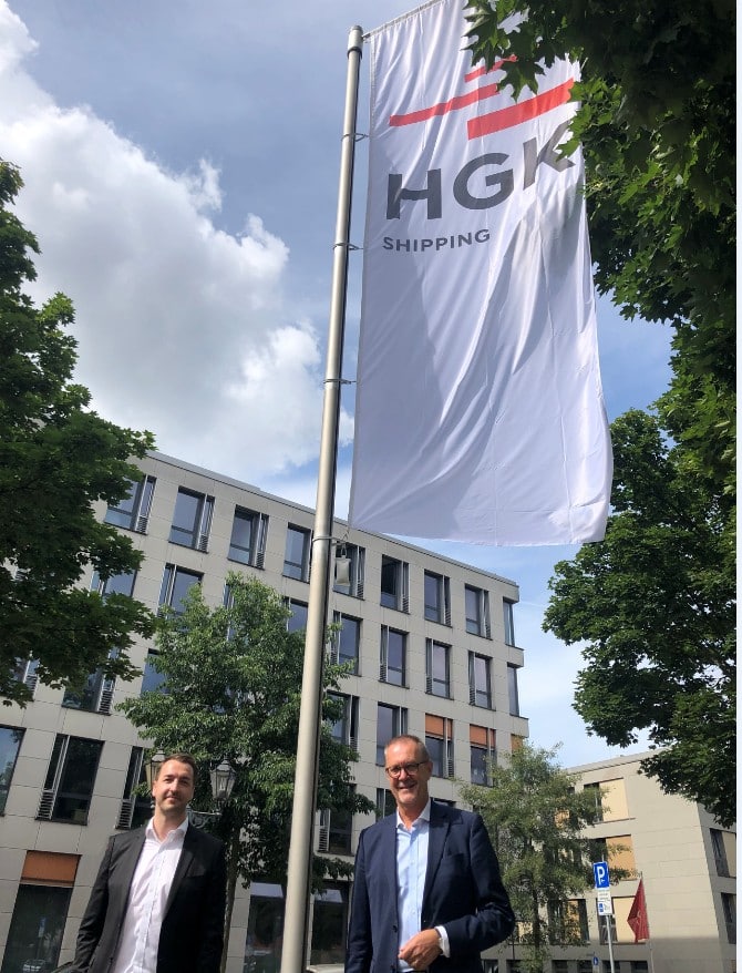 Fotos: © HGK / Foto 1: Das neue HGK-Logo flattert im Wind / Bild 2: HGK Vorstand Uwe Wedig (im Bild rechts) und HGK Shipping Geschäftsführer Steffen Bauer (im Bild links) hissen die neue Firmenflagge vor der operativen Zentrale der HGK Shipping GmbH in Duisburg Ruhrort.