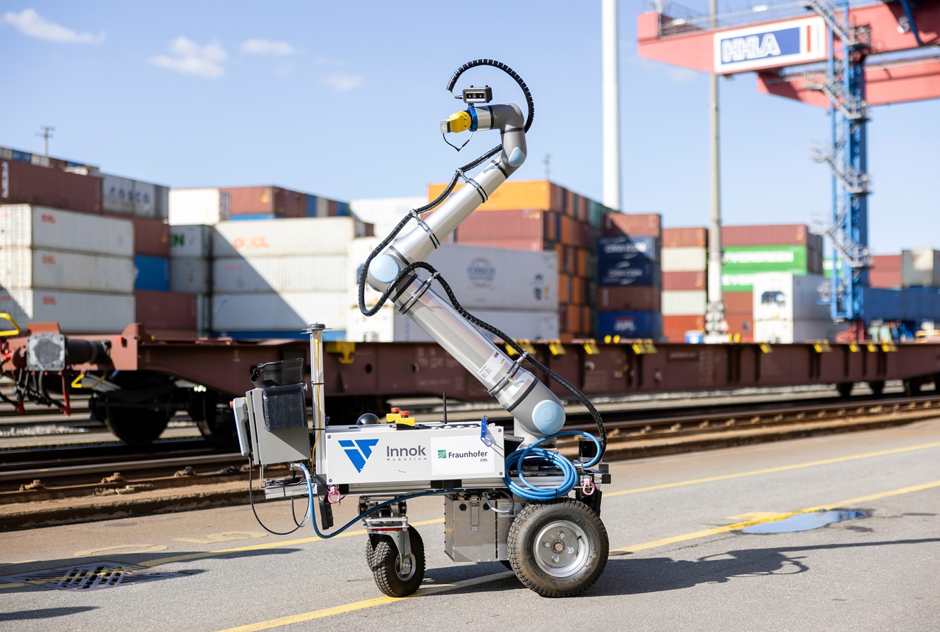 Die Hamburger Hafen und Logistik AG (HHLA) und das Fraunhofer-Center für Maritime Logistik und Dienstleistungen (CML) haben das Forschungsprojekt „Pin-Handling-mR“ erfolgreich abgeschlossen. Ziel des IHATEC-Projekts war die Entwicklung eines mobilen Roboters, der das manuelle Umsetzen von Arretierungszapfen (Pins) auf Containertragwagen automatisiert. Die innovative Lösung für die Bahnabfertigung wurde unter Realbedingungen am HHLA Container Terminal Tollerort (CTT) getestet.