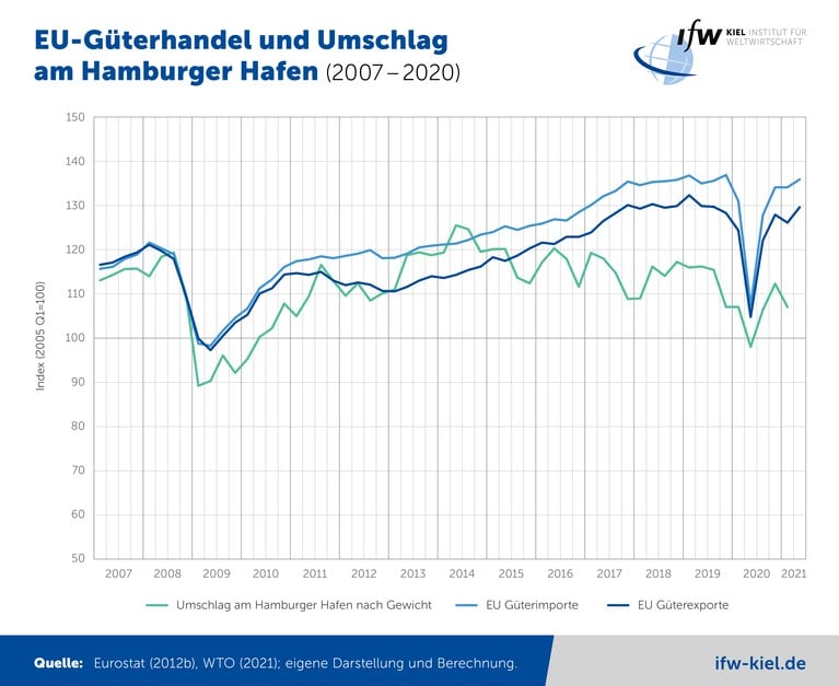 „Doch der temporäre Rückgang des Umschlags im Zuge der Corona-Krise erscheint als ein eher nachrangiges Problem des Hamburger Hafens“, sagt Levke Jessen-Thiesen, Forscherin am IfW Kiel und Autorin der Studie. Der Umschlag im Hafen habe sich vom grundsätzlichen Wachstumstrend im Güterhandel entkoppelt: Die Im- und Exporte der EU nehmen stetig zu und haben im Jahr 2021 wahrscheinlich etwa 30 Prozent über dem Niveau von 2005 gelegen. Dagegen lag der Gesamtumschlag im Hamburger Hafen im ersten Quartal 2021 mit 27,6 Millionen Tonnen nicht weit über dem Wert von 25,8 Millionen Tonnen im ersten Quartal 2005. Seit 2014 ist der Gesamtumschlag auf einem Abwärtstrend. Das liegt nicht daran, dass der Seeverkehr insgesamt für die europäischen Ein- und Ausfuhren in diesem Ausmaß an Bedeutung verloren hätte. Die Entkopplung von Hafenumschlag und EU-Güterhandel weist vielmehr darauf hin, dass der Hamburger Hafen im Wettbewerb hinter andere Häfen zurückfällt.