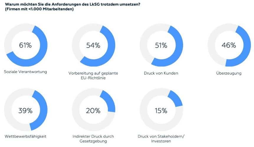 Die Beweggründe, Nachhaltigkeit in der Lieferkette zu etablieren, sind bei den für die Studie befragten Personen unterschiedlich, lassen sich aber in drei Kategorien gliedern: Einhaltung von Gesetzen (56 Prozent), Überzeugung bzw. gesellschaftliche Verantwortung (40 Prozent) sowie Stärkung der Wettbewerbsfähigkeit (34 Prozent). Die drei wichtigsten Nachhaltigkeitsthemen sind Umweltschutz (87 Prozent), Menschen- und Arbeitsrechte (84 Prozent) und Arbeitssicherheit (68 Prozent).