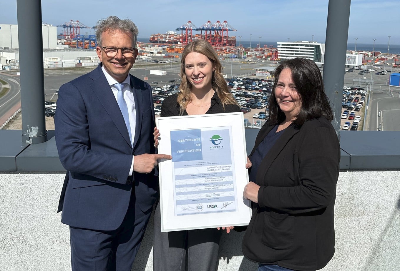 Foto: © JadeWeserPort / Bildlegende: Holger Banik, Geschäftsführer JadeWeserPort und NPorts, Denise Schablitzki, Strategische Unternehmensentwicklung NPorts und Silke Lüders, Umweltkoordinatorin JadeWeserPort