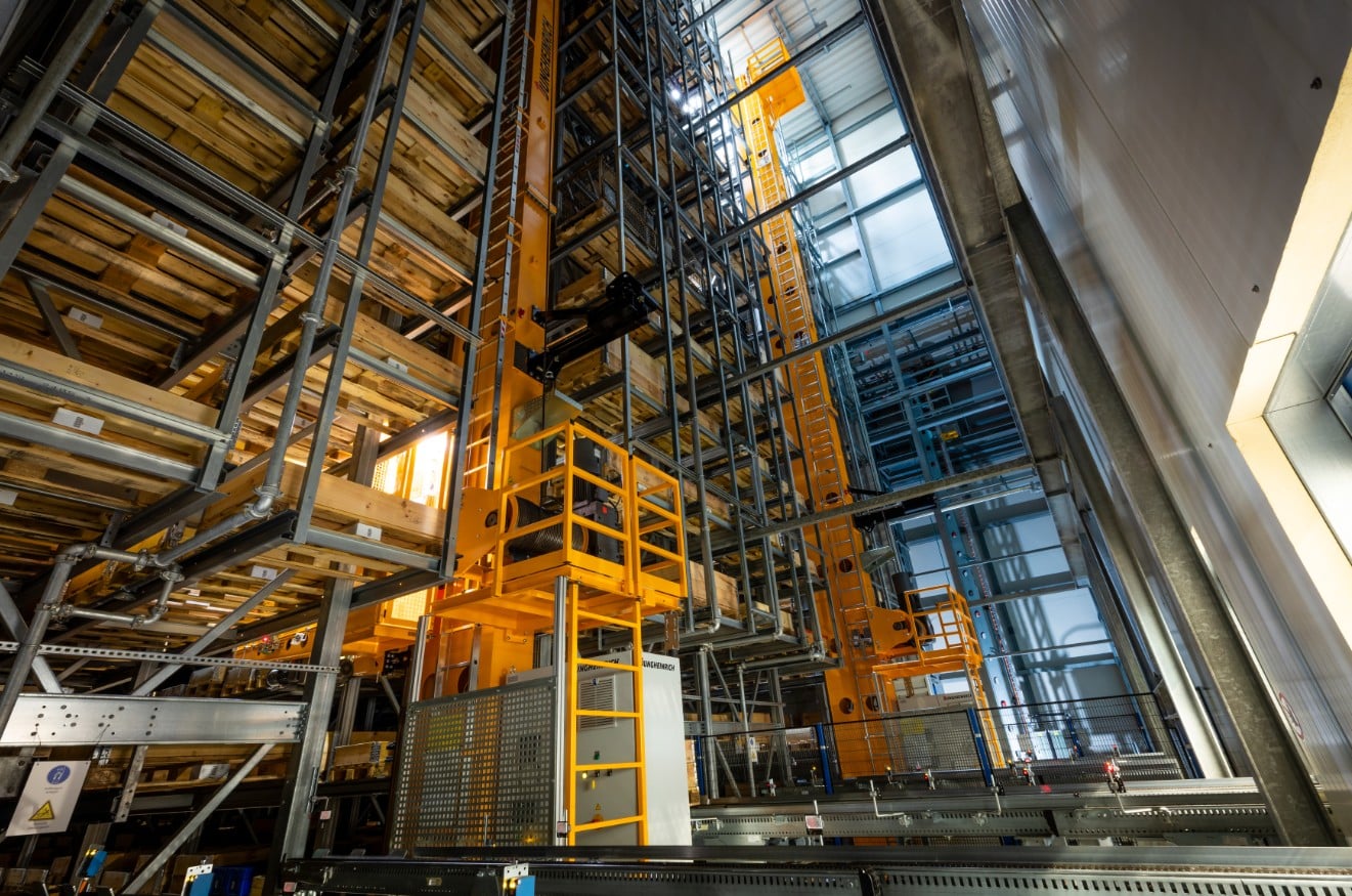 Dafür wurde das 50 Meter lange und 23 Meter hohe Bauwerk des Silo-Hochregallagers um 7,5 Meter verbreitert. Bei laufendem Betrieb und unter erschwerten Corona-Bedingungen wurde so Platz für rund 2.600 zusätzliche Paletten geschaffen. Wie schon bei den bestehenden Gassen des Hochregallagers kommt hier ein Regalbediengerät vom Jungheinrich-Tochterunternehmen MIAS zum Einsatz. Mit einer Nutzlast von 1.000 Kilogramm ist es in der Lage, bis zu 30 Doppelspiele mit 15 Umlagerungen pro Stunde zu realisieren.