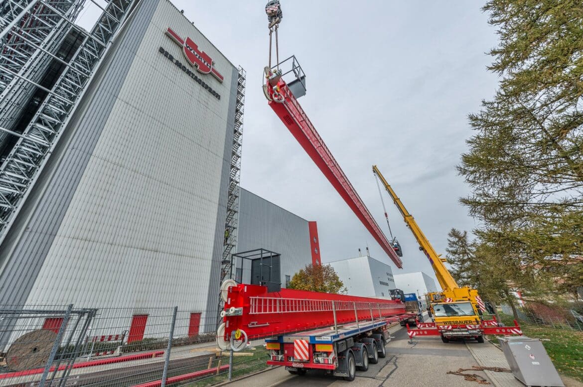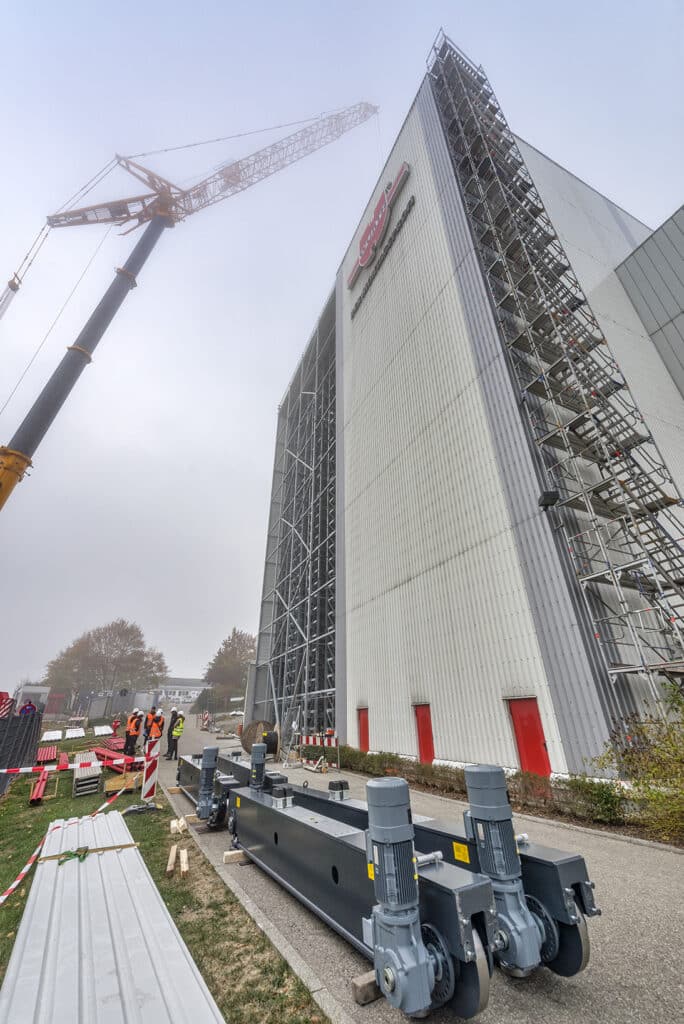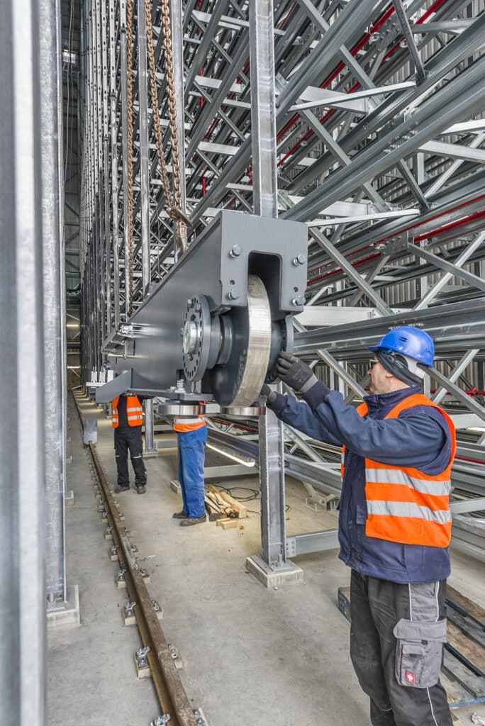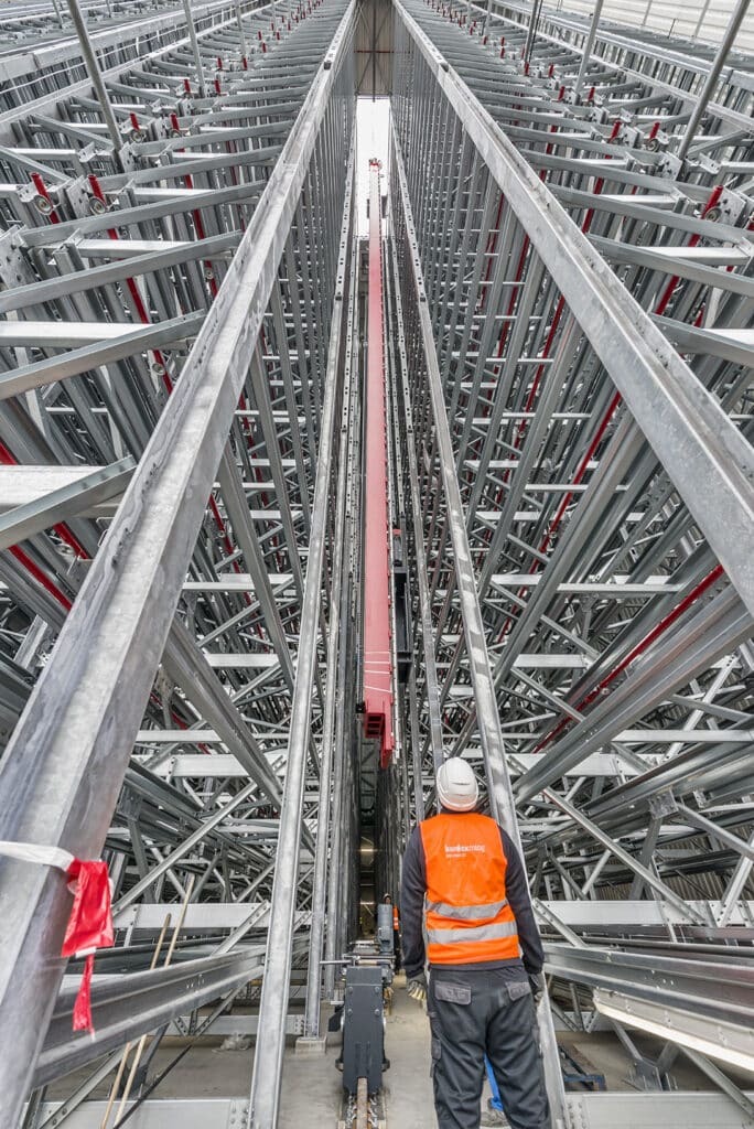 Kardex Mlog baute, lieferte und montierte 4 Regalbediengeräte (RBG) vom Typ MSingle B 1200 mit Gangausrüstung und Automatiksteuerung, die in die bestehende Anlage auf 3 Stockwerken integriert wurde. Die Einsäulen-RBGs wurden am 23. Oktober 2018 über eine Dachöffnung in das Lager eingebracht. Die Geräte verfügen über einen Fahrerstand, sind 35,5 m hoch und für eine Traglast von bis zu 2,4 to ausgelegt. Mit einer Fahrgeschwindigkeit von bis zu 180 m/min und einer Hubgeschwindigkeit von bis zu 70 m/min können sie sich innerhalb der 70 m langen Gassen schnell bewegen.
