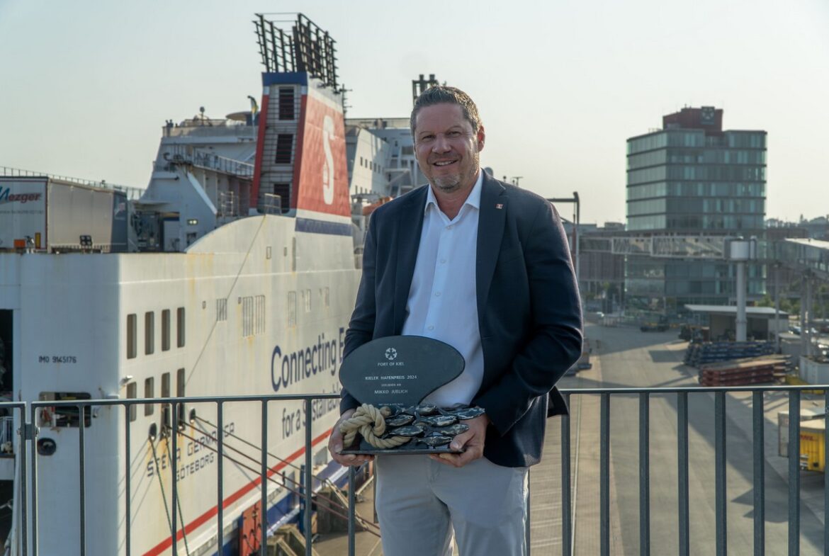 Geehrt wurden die Bemühungen Juelichs besonders im Ausbau des Intermodalbereichs in Kiel. Stena Line gehört seit vielen Jahren zu den Kunden mit dem höchsten Intermodalsplit im Kieler Hafen. Seit Anfang des Jahres setzt die Reederei außerdem einen neuen Stena Line-Intermodalzug zwischen Kiel und Verona ein, den das Unternehmen eigenständig organisiert. Damit setze Stena Line auch in den Zeiten ein deutliches Zeichen für „Fracht auf der Schiene“, die von einer maroden deutschen Bahninfrastruktur und unzuverlässigen Zugverkehren geprägt seien. Darüber hinaus sei ein aktiver Beitrag zu mehr Nachhaltigkeit im Transportwesen. Der Kombinierte Verkehr ermöglicht Einsparungen von C02-Emissionen von bis zu 90 Prozent im Vergleich zum reinen Straßentransports von Fracht. Auch in anderen Bereichen verfolgt Stena Line in Kiel klare Nachhaltigkeitsbestrebungen: Die Reederei setzt nicht nur seit Jahren auf den Methanolantrieb der Stena Germanica, sondern auch auf die Nutzung von grünem Landstrom bei jeder Liegezeit in Kiel, sowie die CO2-Kompensation für Frachtkunden. Damit passe Stena Line in die Unternehmensstrategie des PORT OF KIEL, der bis 2030 klimaneutral sein will.