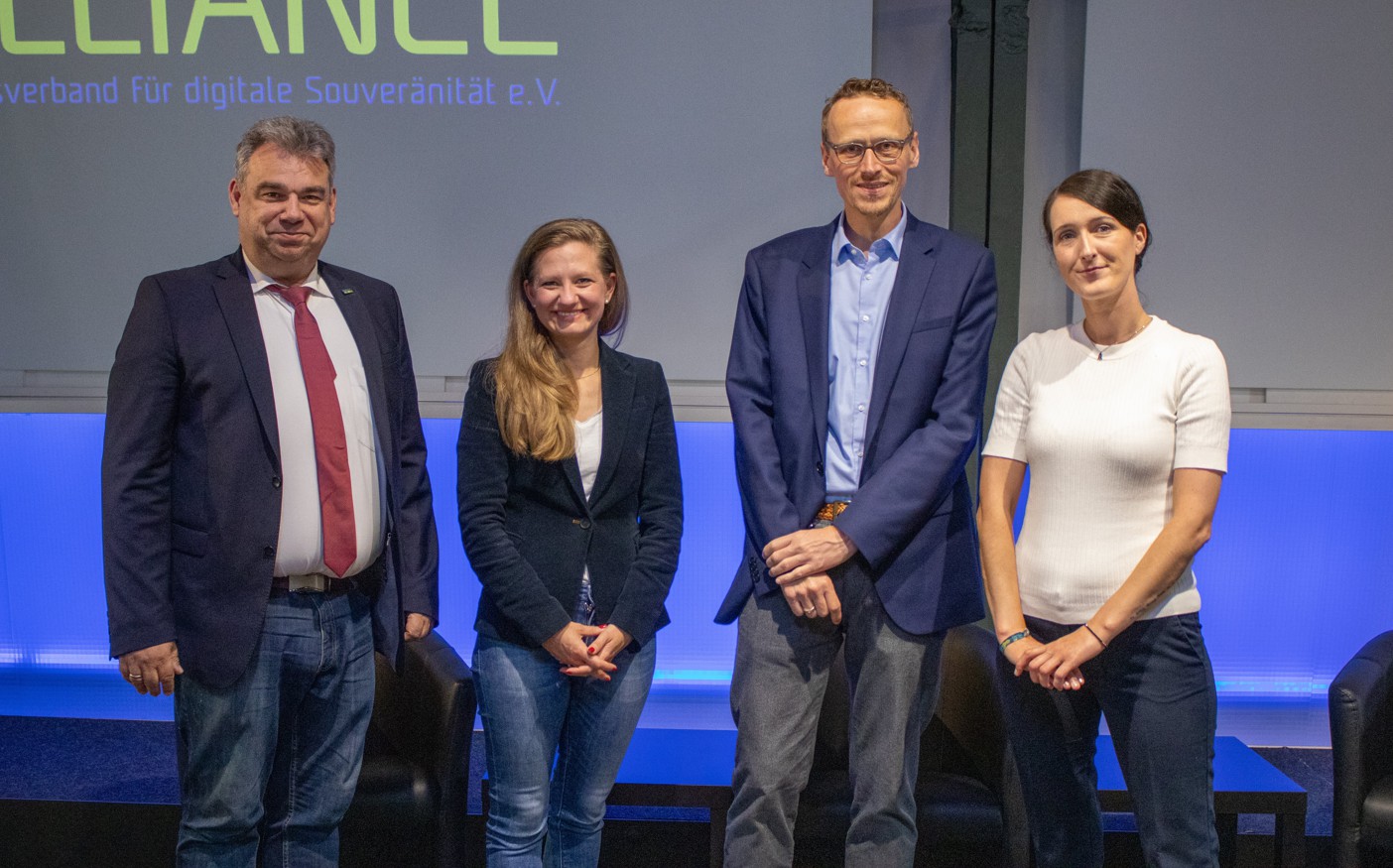 Foto: © Open Logistics Foundation / Bildlegende (v.l.n.r.): Open Source Business Alliance: Lothar Becker, Vorstandsmitglied der Open Source Business Alliance, Carina Tüllmann, COO Open Logistics Foundation, Andreas Nettsträter, CEO Open Logistics Foundation, Miriam Seyffarth, Leiterin Politische Kommunikation Open Source Business Alliance