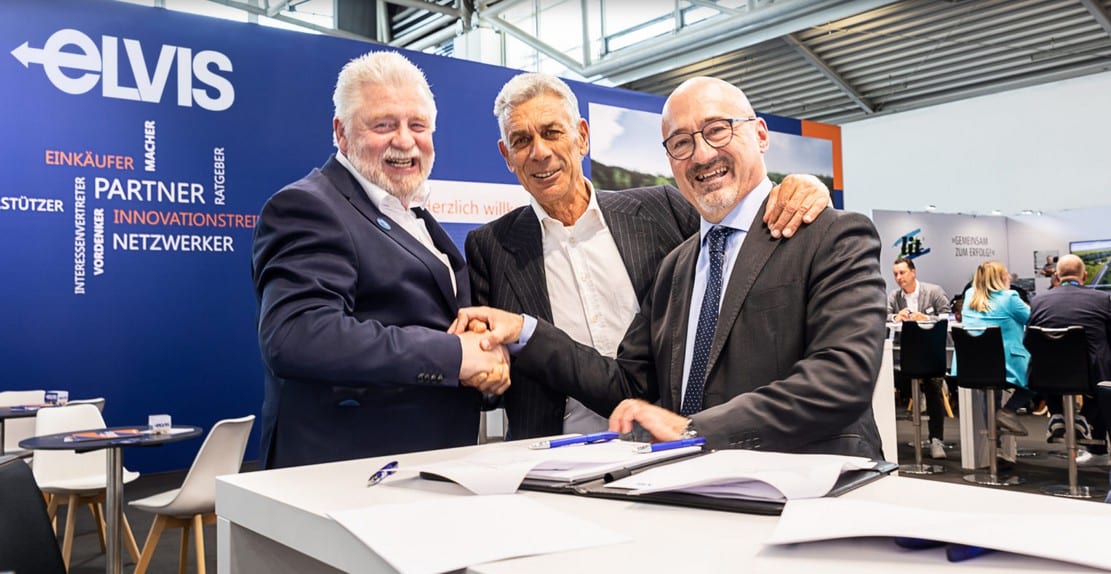 Fotos: © ELVIS / Legende Titelbild (v.l.n.r): Zelebrieren an der Messe in München ihre Zusammenarbeit: Jochen Eschborn (l.), Vorstandsvorsitzender der ELVIS AG, Claudio Simone (m.), Präsident ABC Business Network, und Matteo Ravazzin (r.), Executive Director Business Network