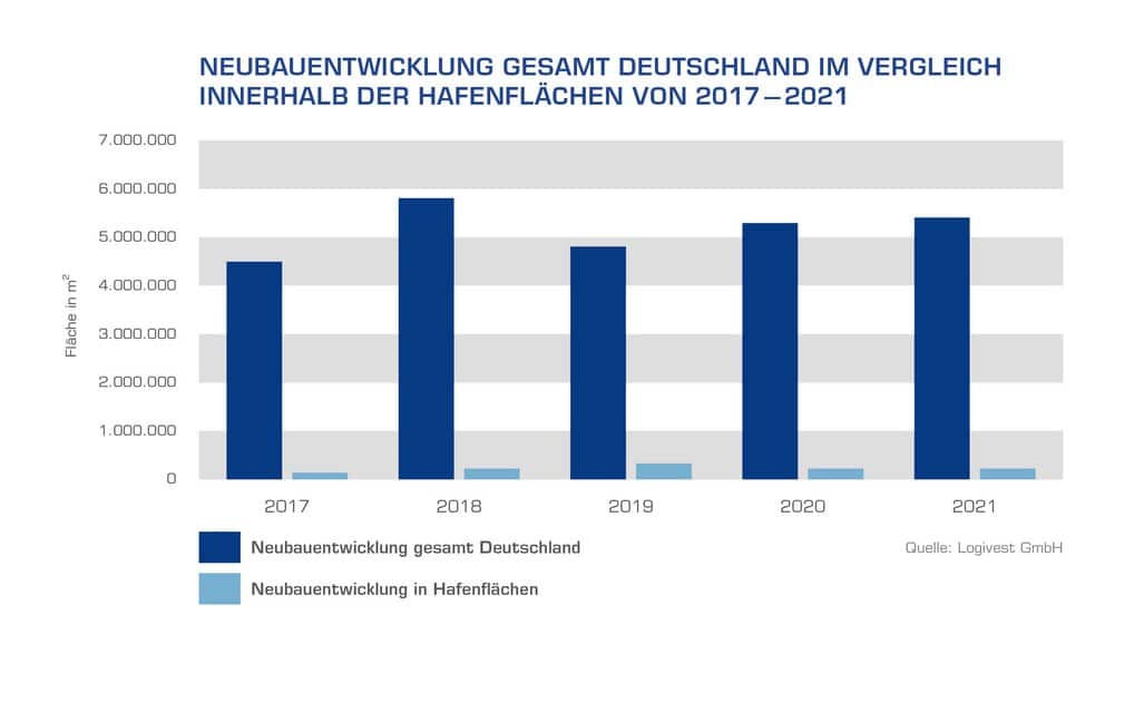 Laut einer Untersuchung des Logistikimmobilienberaters Logivest befinden sich lediglich 1,2 Millionen Quadratmeter der von 2017 bis 2021 in Deutschland neu gebauten 26 Millionen Quadratmeter Logistikfläche innerhalb von Hafenflächen. Das sind rund 4,6 Prozent. Innerhalb eines Radius von einem Kilometer um die Häfen waren es immerhin bereits 2,1 Millionen Quadratmeter, und innerhalb eines Radius von zwei Kilometern 2,9 Millionen Quadratmeter.