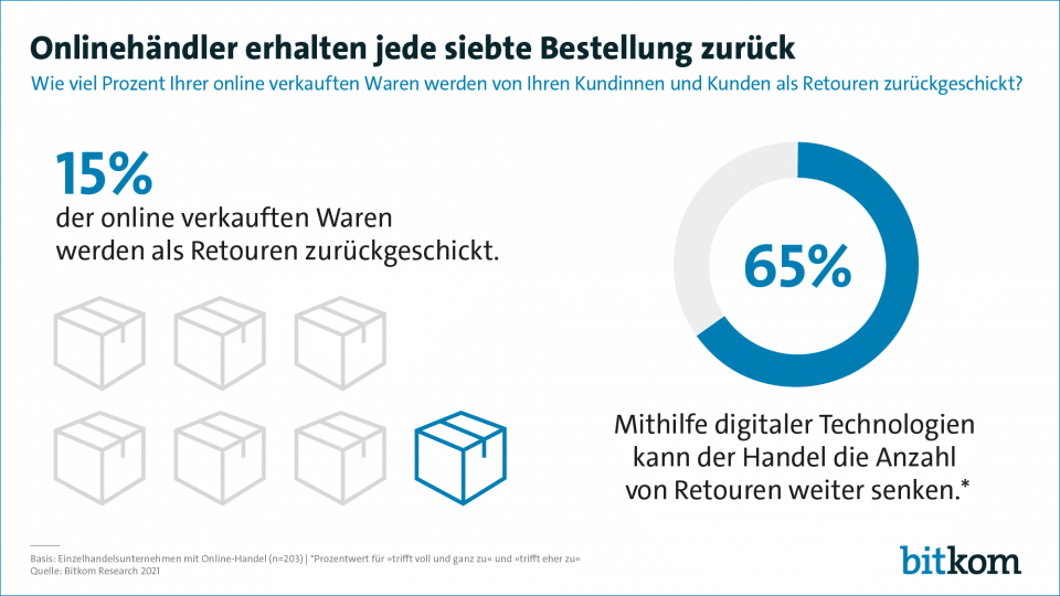 Eine Umfrage von Bitkom Research zeigt: 15 Prozent der online bestellten Waren werden zurückgeschickt. Die Retouren belasten das Geschäft fast jedes zweiten Online-Einzelhändlers. Zwei Drittel sind der Meinung, digitale Technologien, wie Kleidung virtuell anprobieren oder Möbel ins Wohnzimmer projizieren, können die Anzahl an Retouren senken.