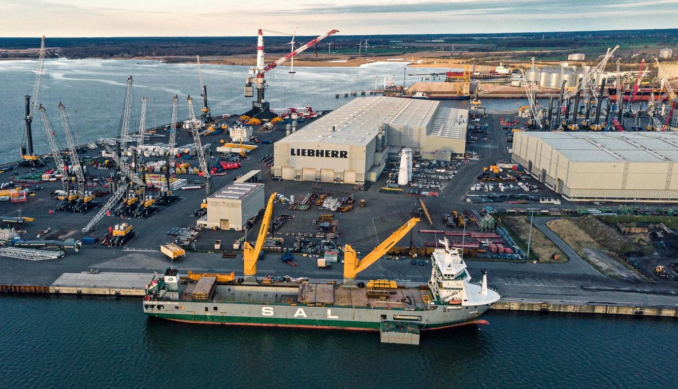 Foto: © Liebherr-MCCtec Rostock GmbH / Bildlegende: Der LHM 550 beim Direkt-Verlad im Liebherr-Werk in Rostock