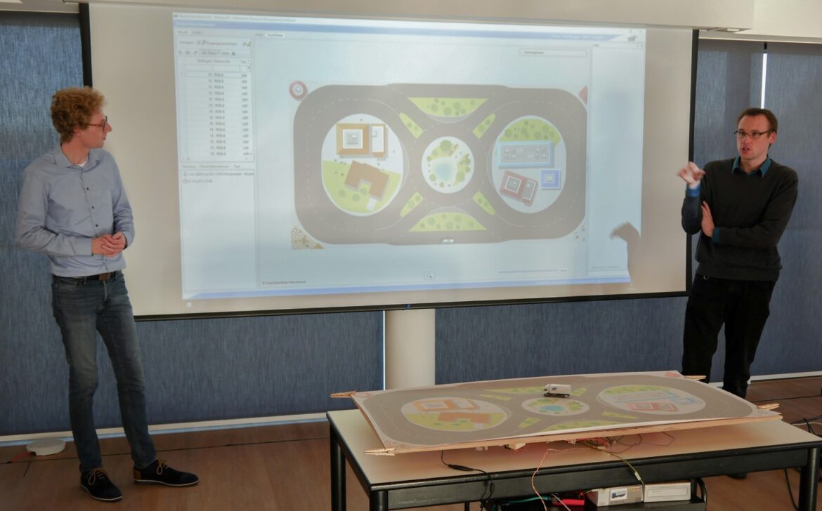 (Greven/Steinfurt) Lucas Weckermann und Lukas van der Stok, Duale Studenten der LIS entwarfen eine Miniatur-Straßenkarte, auf der sie mithilfe von Magnetstreifen und -sensoren kleine Spielzeugfahrzeuge fahren lassen und zugleich über das LIS-TMS WinSped orten können. Für den Grevener Software-Entwickler ist dieser Parkour en miniature eine neue Möglichkeit, sein Produkt auf Messen anschaulich zu präsentieren.