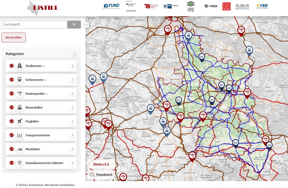 Das DiSTILL-Tool ermöglicht die Zusammenführung und Aufbereitung externer Daten über benutzerfreundliche Schnittstellen und bietet erweiterte Funktionen zur Datenpflege. Mithilfe des Tools können Akteure aus der Logistikbranche relevante Standort-, Infrastruktur- und Transportinformationen visualisieren und bewerten. Im Fokus stehen Anwendungen im Bereich multimodaler Transporte – der Verknüpfung von Straße, Schiene und Wasser –, die auf datenbasierte Entscheidungsprozesse ausgerichtet sind.