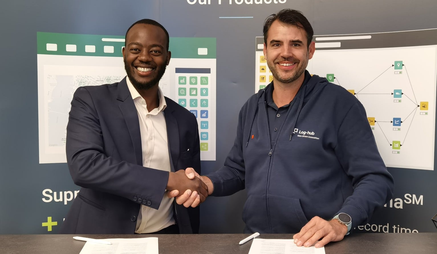 Foto: © Log-hub AG / Bildlegende: Gerald Chifamba, Head of Business Development bei Pledge, und Dirk Hanschur, Geschäftsführer der Log-hub AG, bei der Vertragsunterzeichnung auf dem Deutschen Logistik Kongress in Berlin