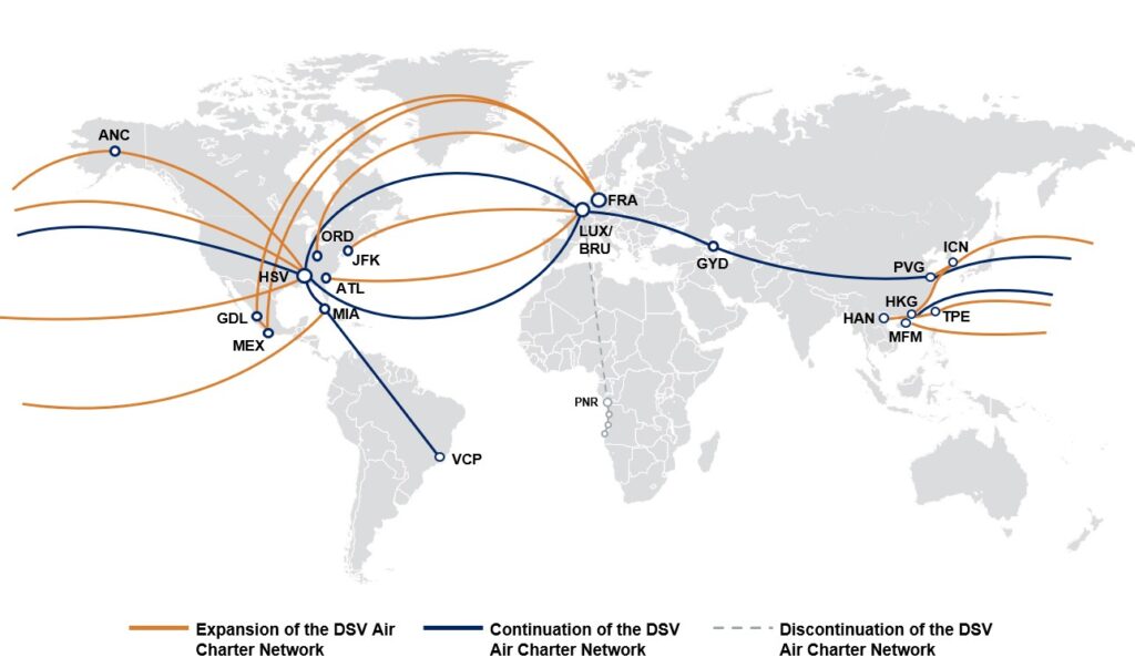 DSV kooperiert mit führenden globalen Frachtfluggesellschaften, um das Netzwerk um folgende Strecken zu erweitern:
