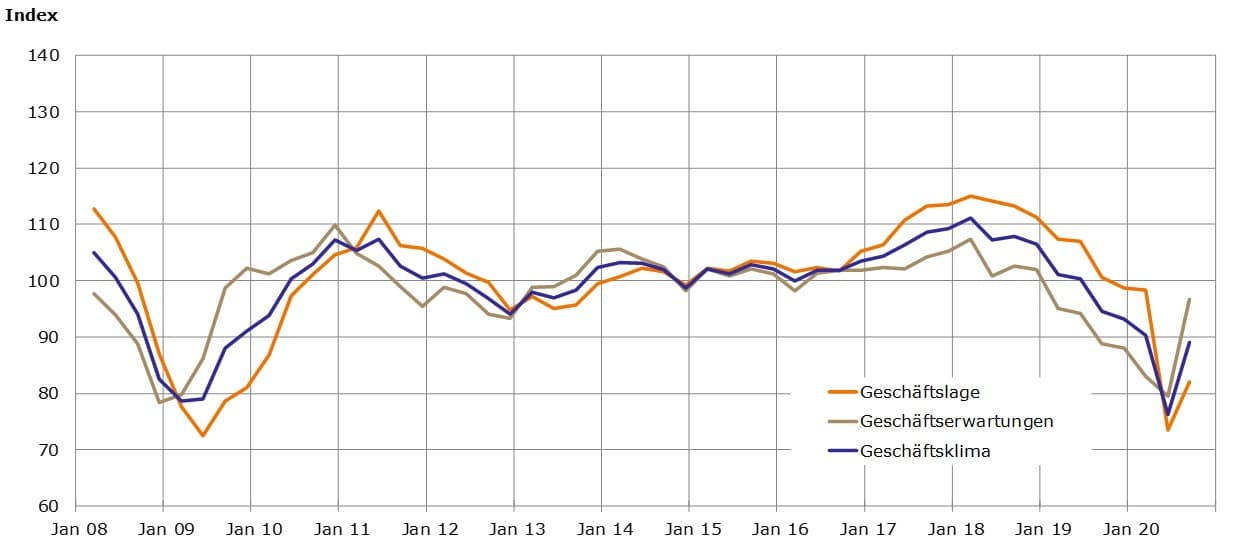 Das Bundeswirtschaftsministerium geht in seiner Prognose von Anfang September davon aus, dass die gesamte deutsche Wirtschaft im laufenden Jahr um 5,8 Prozent schrumpfen und dann im Jahr 2021 wieder um 4,4 Prozent wachsen wird.