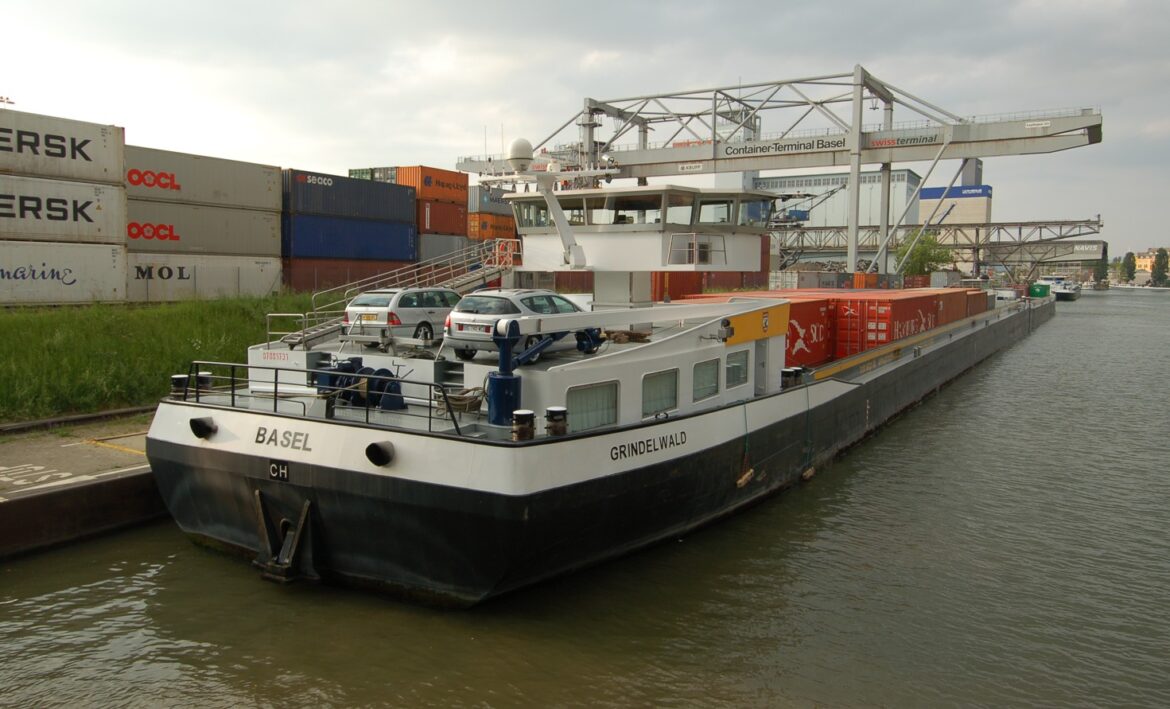 Foto: © Loginfo24 / Bildlegende: Die MS „Grindelwald“ im Hafenbecken I der Schweizerischen Rheinhäfen Basel (Wobei ausgerechnet diese vorhandene Logistik-Infrasturktur ab 2029 zur Disposition steht…)