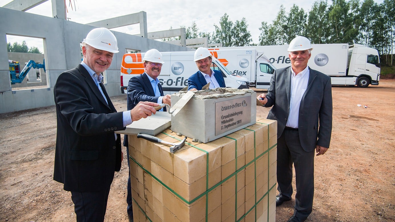 Foto: © trans-o-flex / Bildlegende: (von links): Peter Morgenroth, designierter Niederlassungsleiter des Standorts Wildenfels, Wolfgang P. Albeck, trans-o-flex-CEO, Christoph Schoeller, Gesellschafter von trans-o-flex, und Tino Kögler, Bürgermeister der Stadt Wildenfels.