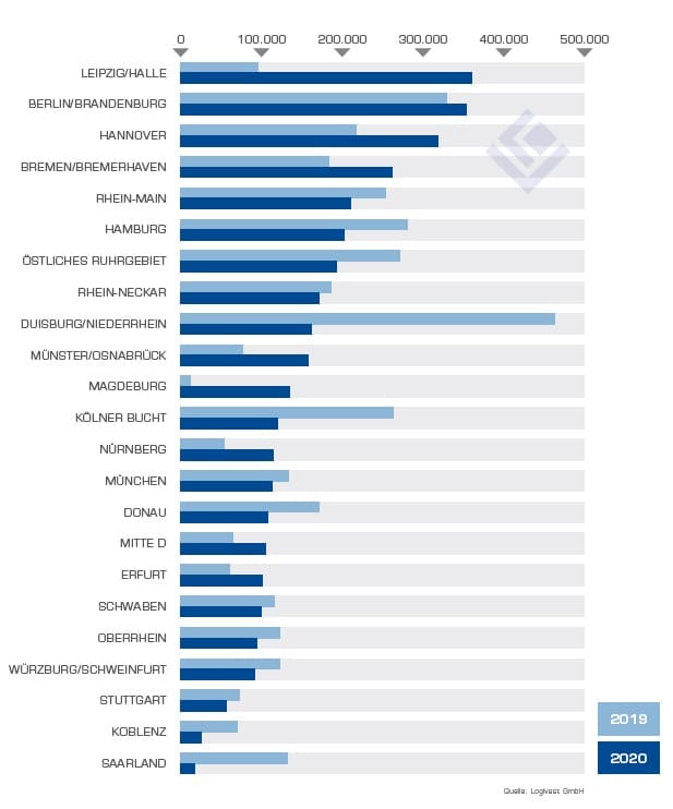 Im Jahresverlauf zeigten sich die insgesamt 23 deutschen Top-Logistikregionen sehr dynamisch. Während neun Regionen ihren Vorjahreswert teilweise massiv übertreffen konnten, fielen die 14 weiteren Top-Logistikregionen hinter das Ergebnis von 2019 zurück. Den beeindruckendsten Aufstieg legt die Top-Logistikregion Leipzig/ Halle an den Tag: von Platz 22 (2019) auf Platz eins (2020). Mit einem Neubauvolumen von 360.000 Quadratmetern wurde der Vorjahreswert um mehr als das Dreifache übertroffen. Platz zwei erreichte mit 355.000 Quadratmetern die Region Berlin / Brandenburg (2019: Platz drei). In diese Erhebung fließt die neu errichtete Tesla-Gigafactory nicht mit ein, da es sich um ein Werksgelände handelt, bei dem sich Produktion und Logistik nicht voneinander abgrenzen lassen. Den dritten Platz erreichte die Region Hannover mit 320.000 Quadratmetern (2019: Platz vier).