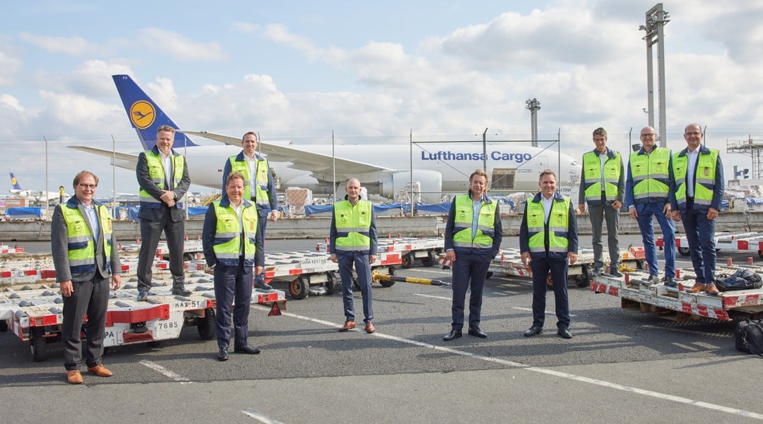 Foto: © Lufthansa Cargo / Bildlegende: v.l.n.r.: Walter Isselhard, Harold Lukas, Dr. Jan Wilhelm Breithaupt, Tim Heppenheimer, Bonne van der Meer, Edwin Hageman, Harald Gloy, Dr. Jochen Göttelmann, Gerd Jens Schmidt, Dr. Mohammad Ali Seiraffi