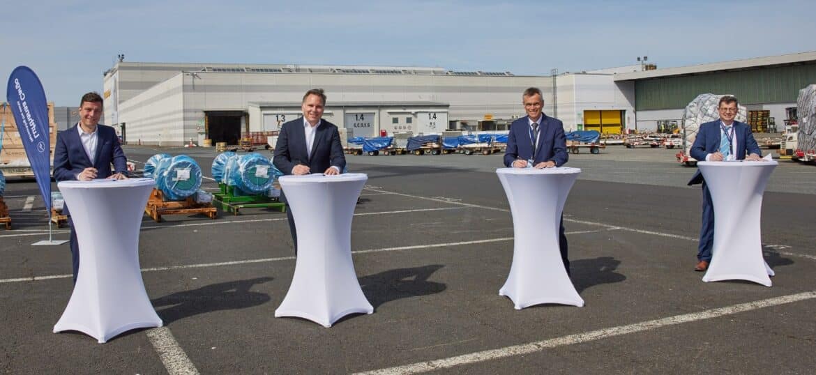 Foto: © Lufthansa Cargo / Bildlegende: vrnl.: Gunnar Löhr, Head of Supply Management & Infrastructure Lufthansa Cargo AG, Harald Gloy, COO Lufthansa Cargo AG, Anton Schirle, CEO Bleichert Automation, Manfred Hannes, Head of Sales Bleichert Automation