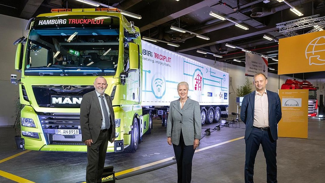 MAN Truck & Bus und die Hamburger Hafen und Logistik AG haben das Pilotprojekt Hamburg TruckPilot im Sommer 2021 erfolgreich abgeschlossen. Die Zielsetzung des dreijährigen Projektes, das zugleich Teil der strategischen Mobilitätspartnerschaft zwischen der Stadt Hamburg und der Volkswagen AG war, beinhaltete Entwicklung und Praxistest eines autonomen Lkw im Containerumschlag auf dem HHLA Container Terminal Altenwerder (CTA). Bei den Praxisfahrten beförderte der Logistikpartner, die Spedition Jakob Weets e.K. aus Emden, zunächst von einem Fahrer gesteuert 40-Fuss-Container im Auftrag der Volkswagen Konzernlogistik zum CTA-Terminal im Hamburger Hafen. Dort fuhr der Lkw autonom über das Terminalgelände und bewegte sich reibungslos im gemischten Verkehr mit anderen Verkehrsteilnehmern. Er fuhr sein Ziel- in der Blocklagerspur an und rangierte ebenfalls selbstständig rückwärts hochgenau in die Parkposition. Nach dem Containerumschlag erfolgte die Rückfahrt zum Check-Gate ebenso autonom und jenseits des Terminalgeländes übernahm wieder der Fahrer der Spedition Jakob Weets e.K. das volle Kommando.