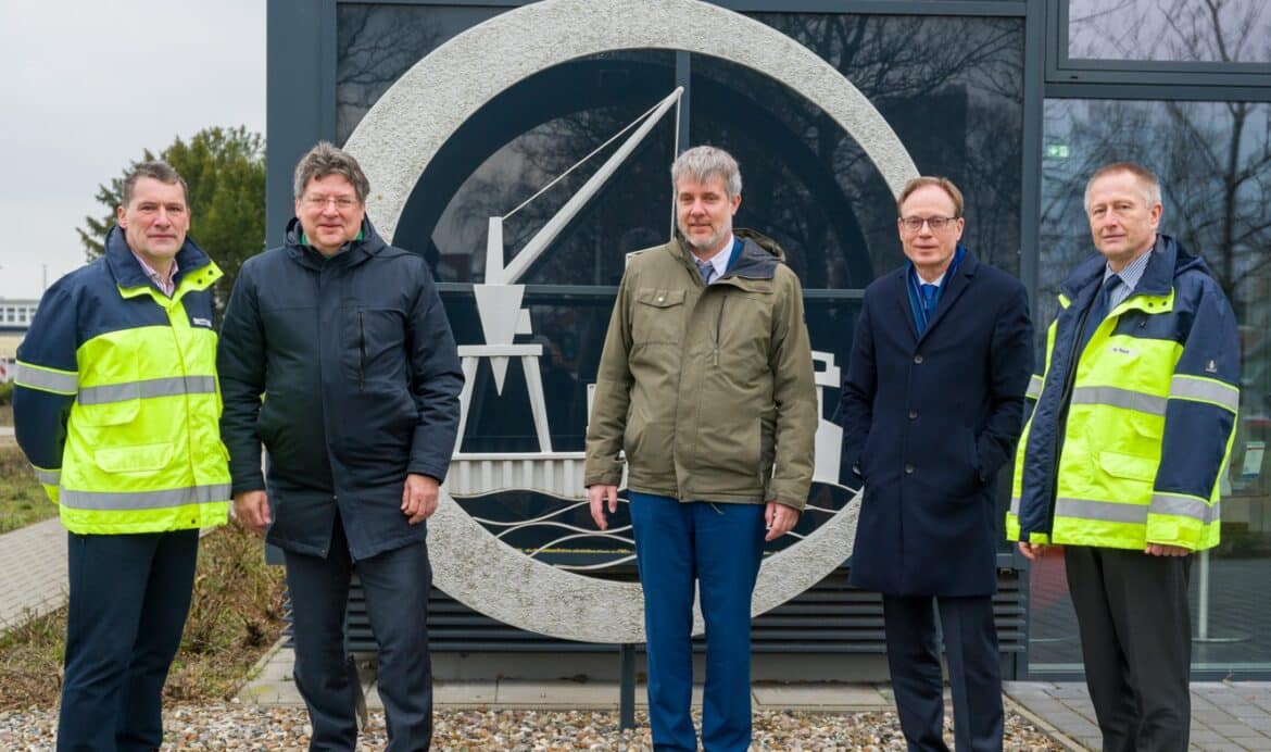 Foto: © ROSTOCK PORT – Nordlicht / Bildlegende: (von links nach rechts) ROSTOCK PORT-Geschäftsführer, Jens A. Scharner, Wirtschaftsminister des Landes Mecklenburg-Vorpommern, Reinhard Meyer, Koordinator der Bundesregierung für maritime Wirtschaft und Tourismus, Dieter Janecek, Wirtschaftsstaatssekretär des Landes Mecklenburg-Vorpommern, Jochen Schulte und ROSTOCK PORT-Geschäftsführer, Dr. Gernot Tesch.