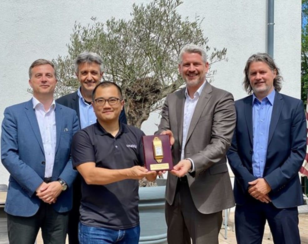 Foto: © UnaBiz / Bildlegende: vlnr. Thomas Scheibel, CEO Heliot Europe/ Christophe Fourtet, Mitgründer von Sigfox & Erfinder der Sigfox 0G Technologie/ Henri Bong, Mitgründer & CEO UnaBiz/ Sascha Kunzmann, VP Engineering Alps Alpine/ Patrick Fiack, Key Account Manager DHL Alps Alpine