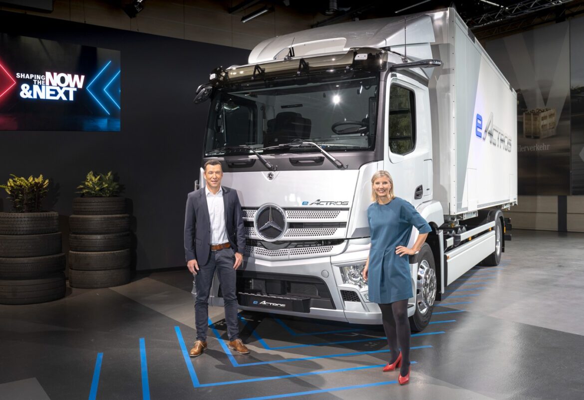 Foto: © Daimler Truck / Bildlegende: (von links nach rechts) Andreas von Wallfeld, Leiter Marketing, Vertrieb und Service Mercedes-Benz Lkw. Karin Rådström, Vorstandsmitglied Daimler Truck AG und Leiterin Mercedes-Benz Trucks.