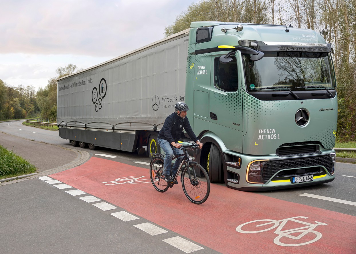 „Wir entwickeln Technik, die Schwächen des Menschen ausgleichen kann – besonders dort, wo Sekunden und Zentimeter entscheiden. Der Schutz der Schwächsten im Straßenverkehr ist unsere Verantwortung“, erläutert Dr. Rainer Müller, Leiter Produktentwicklung (Product Engineering) bei Mercedes-Benz Trucks.