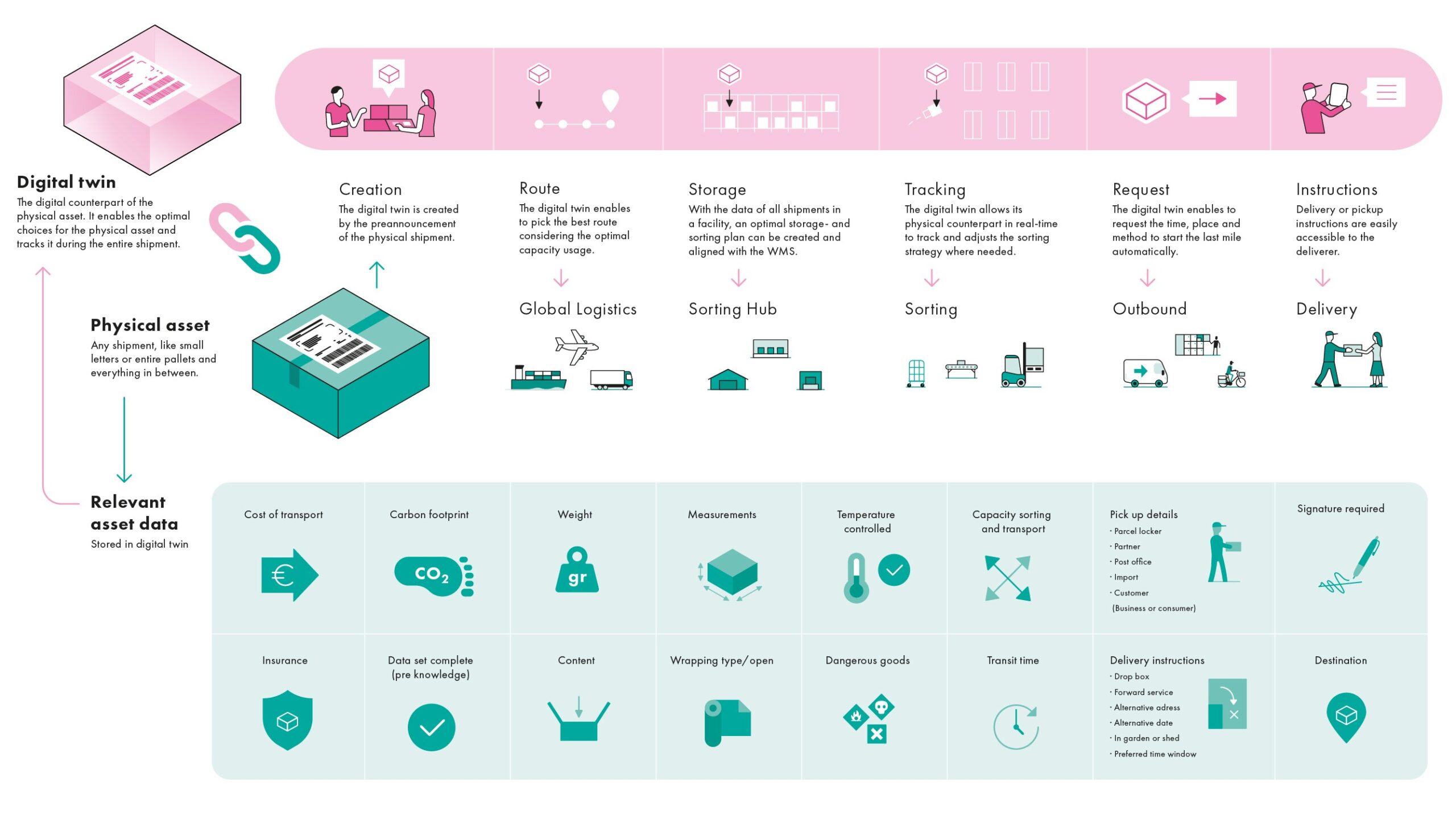 Ein digitales Abbild des Gesamtbetriebs kann die physische Welt konkret beeinflussen und den Grundstein für dynamische Sortierung und selbstorganisierende Logistik legen. Mit den virtuellen Gegenstücken von Briefen, Paketen und Paletten kann der digitale Zwilling automatisierte Entscheidungen zur Anpassung von Abholungen, Wareneingängen, Sortierung und Zustellungen treffen, um die Geschwindigkeit, Qualität und Flexibilität der Logistikprozesse zu optimieren. Dadurch können Dienstleister ihren Service verbessern und gleichzeitig die Betriebs- und Investitionskosten senken.
