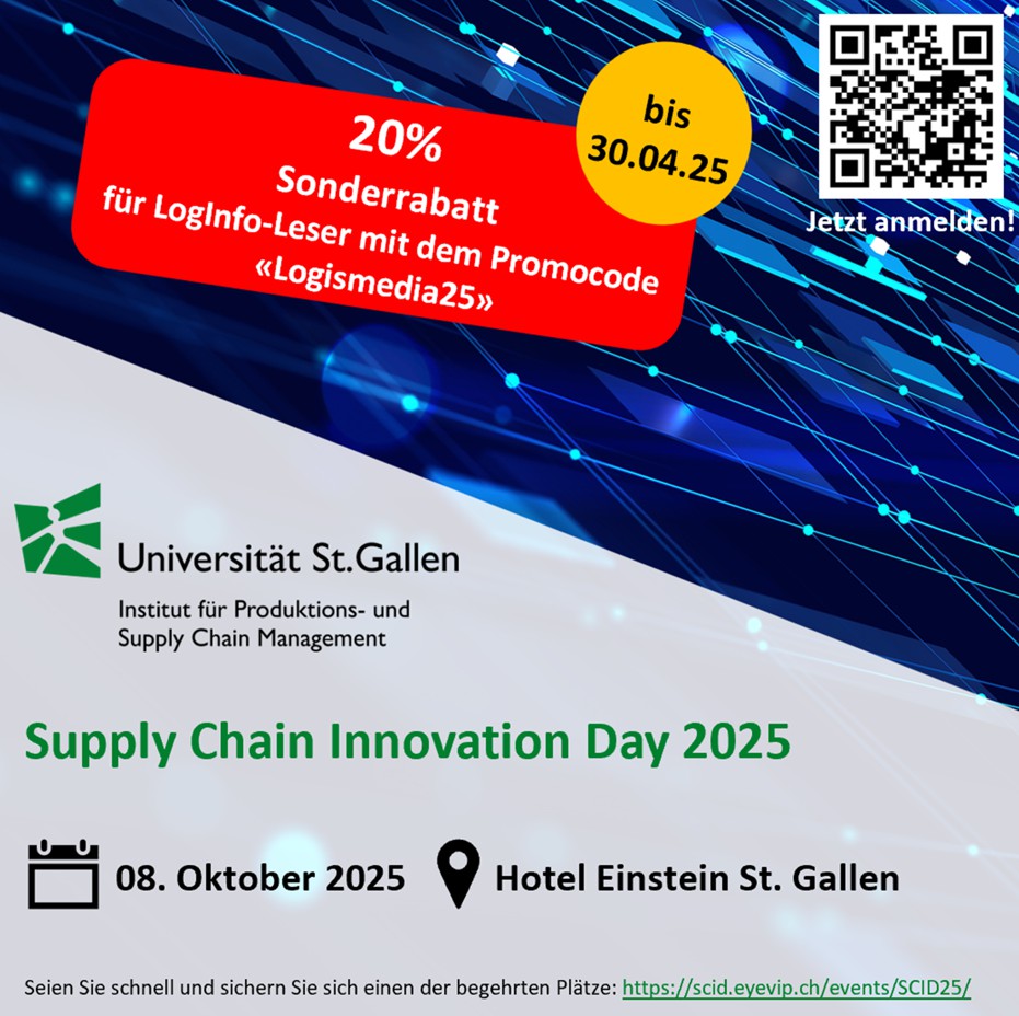 Der zur Tradition gewordene Supply Chain Innovation Day 2025 des Instituts für Produktions- und Supply Chain Management der Uni St. Gallen findet dieses Jahr am 8. Oktober 2025 im Hotel Einstein in St. Gallen statt. Die Logismedia Group AG, zu der auch Loginfo24 gehört, ist Medienpartner. Bis zum 30. April 2025 können Sie von einem Sonderrabatt profitieren. Details zur Anmeldung findet man am Ende des Textes.