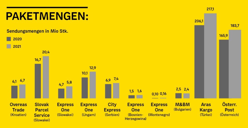 So wurden vergangenes Jahr beispielsweise bei der türkischen Aras Kargo sieben Logistikzentren im gesamten Landesgebiet automatisiert, wodurch die Sortierleistung um 30 Prozent gesteigert werden konnte. Das bestehende Out of Home-Netzwerk wurde auf rund 2.400 Standorte mehr als verdoppelt. Bei allen Töchtern wurden die Empfangsmöglichkeiten der Sendungen ausgebaut und die Kund*innenorientierung verstärkt. Insgesamt gingen 2021 in Südosteuropa 1.845 neue Standorte zum Paketempfang in Betrieb.
