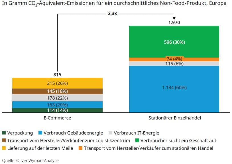 Der E-Commerce hat oftmals eine bessere Klimabilanz als der stationäre Handel. Zu diesem Ergebnis kommt eine gemeinsame Studie der Strategieberatung Oliver Wyman und der Logistics Advisory Experts, einem Spin-off der Universität St. Gallen, in acht europäischen Ländern, darunter Deutschland, Frankreich und Grossbritannien. Laut der Analyse im Auftrag des Online-Händlers Amazon schneidet der Internet-Handel beim CO2-Ausstoss pro verkauftem Artikel über die gesamte Lieferkette hinweg unter den gegebenen Annahmen in den einzelnen Staaten im Schnitt um den Faktor 1,5 bis 2,9 besser ab. Insgesamt erwies sich der Handel als Wachstumsmotor: Um zwei Prozent jährlich legte die Branche zuletzt durchschnittlich zu. Dabei zeigte der E-Commerce mehr Dynamik und erhöhte seinen Marktanteil, insbesondere in Corona-Zeiten, deutlich.