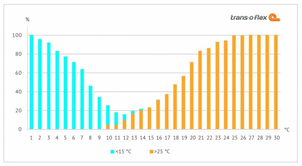 Die Grafik zeigt an, wie hoch das Risiko ist, wenn Sendungen in einem untemperierten Auslieferfahrzeug bei einer bestimmten Außentemperatur bei weniger als 15 oder mehr als 25 Grad Celsius befördert werden. Lesebeispiel: Schon bei einer Außentemperatur von 18 Grad beträgt das Risiko fast 50 Prozent. Eine von zwei Sendungen wird also wahrscheinlich bei mehr als 25 Grad Celsius transportiert.