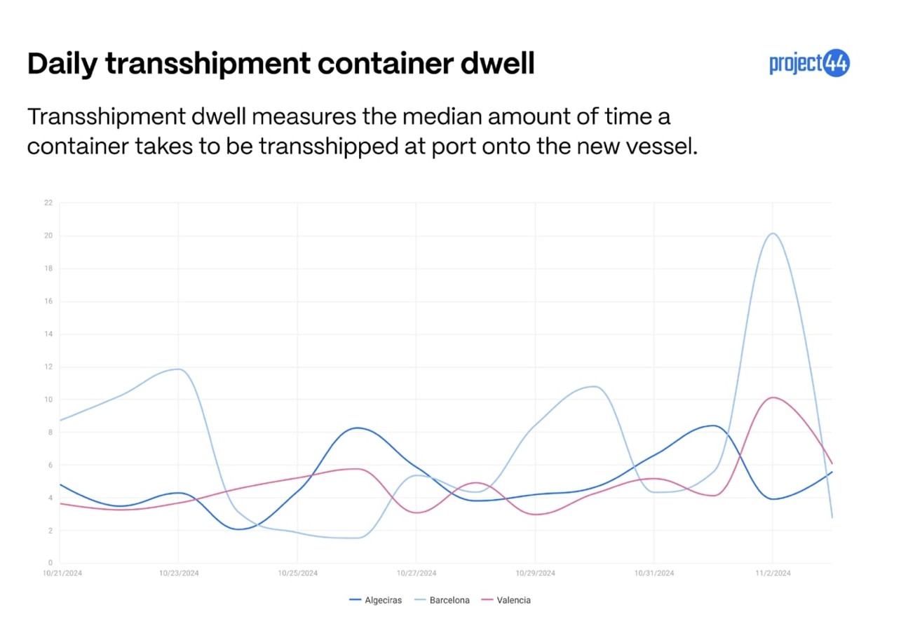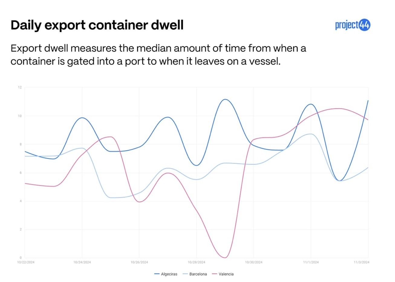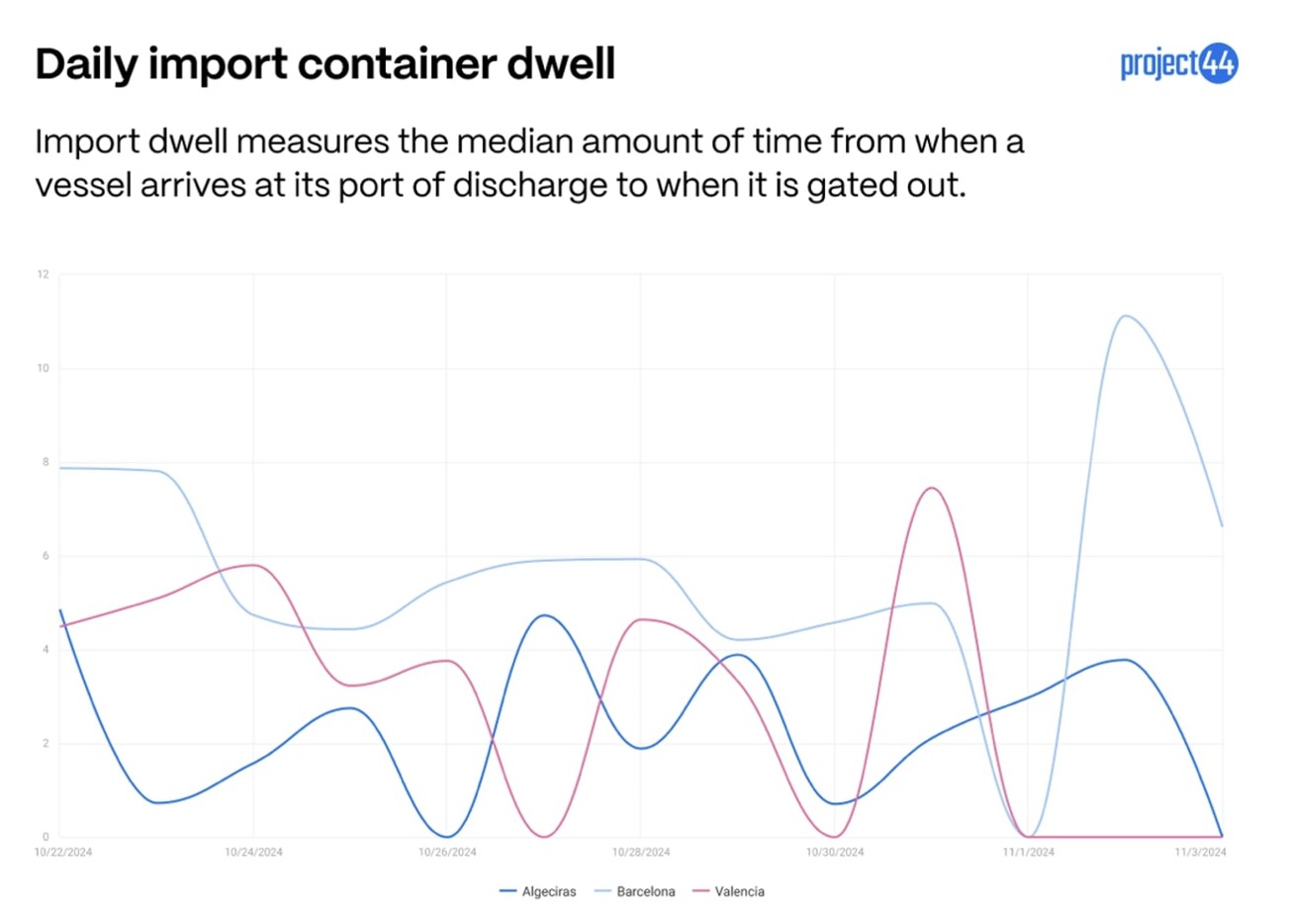 Die Verweildauer der Importe (Abbildung 3) scheint am stärksten von den Stürmen betroffen zu sein, da an mehreren Tagen keine Importcontainer abgefertigt wurden. In Barcelona ist die Verweildauer von Importcontainern bisher am stärksten angestiegen. Die Zahlen könnten noch weiter steigen, da der Hafenbetrieb weiterhin eingeschränkt ist. Zu den Importcontainern gehören wahrscheinlich auch Waren, die für das Weihnachtsgeschäft bestimmt sind. Einzelhändler und Häfen müssen dringenden Containern Vorrang einräumen, um sicherzustellen, dass sie die Regale rechtzeitig erreichen.