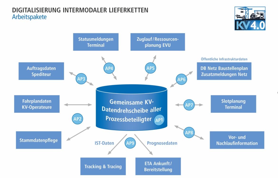 Mit dem Projekt „Digitalisierung intermodaler Lieferketten – KV 4.0“ ist eine wichtige Maßnahme zur Modernisierung und Zukunftsfähigkeit des Intermodalsektors innerhalb der Logistikbranche vorangetrieben worden. Die Verbundpartner DB Cargo, Lokomotion, SBB Cargo Deutschland, KTL Kombi-Terminal Ludwigshafen GmbH, Hupac, HOYER Group, Paneuropa Transport, Hupac Intermodal, Bertschi und Kombiverkehr hatten die Arbeiten am Projekt bereits im September 2017 begonnen. Das Hauptziel von KV 4.0 bestand darin, über die gesamte intermodale Transportkette, beginnend mit der Abholung der Ladeeinheit beim Versender bis hin zur Zustellung beim Empfänger, den logistischen Prozess transparenter und übersichtlicher zu gestalten. Das Projekt war in verschiedene fachliche Arbeitspakete gegliedert. Hierzu zählten beispielsweise „Fahrplandaten KV-Operateure“, „Auftragsdaten Spediteur“, „Statusmeldungen Terminal“ und „Zuglaufmeldung EVU“. Des Weiteren hat die Projektgruppe mit der Entwicklung der neue Datendrehscheibe jetzt die Möglichkeit eröffnet, die für den Endkunden so wichtige Information der Ankunft seiner Ladeeinheit am Zielterminal auszutauschen („ETA Ankunft/Bereitstellung“).