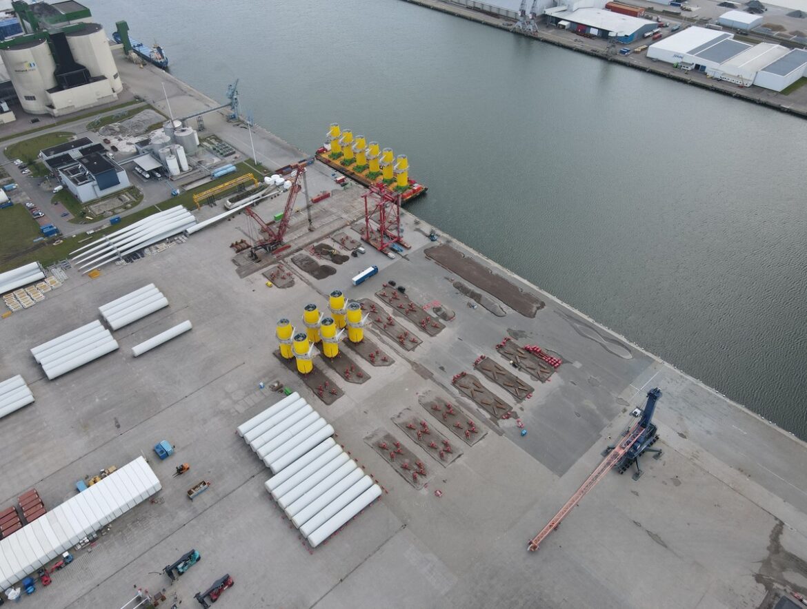 Das Buss Terminal Eemshaven gewann das Ausschreibungsverfahren des Auftraggebers DEME Offshore im Februar und ist ab sofort für Handling, Lagerung und Terminal-Logistik der 165 Monopiles und Transition Pieces auf dem eigenen Terminalgelände verantwortlich.