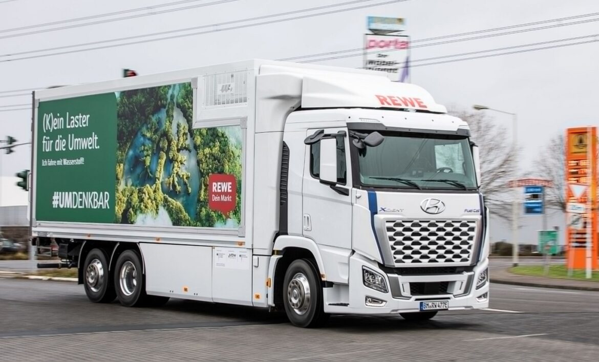 (Köln) Ende Januar rollt der neue Wasserstoff-Brennzellen-LKW Hyundai Xcient Fuel Cell das erste Mal vom Gelände des Logistikzentrums der REWE Region West in Köln-Langel. Damit geht das Unternehmen den nächsten Schritt in einen emissionsarmen Güterverkehr. Denn nach Hochrechnungen des Unternehmens können alleinig durch den Einzeleinsatz des neuen LKW pro Jahr ca. 58.000 kg co2 im Vergleich zu einem herkömmlichen Diesel LKW eingespart werden.  Das Fahrzeug hat ein zulässiges Gesamtgewicht von 27 Tonnen, 18 Europaletten-Stellplätze und eine Reichweite von rund 400 km. Mit der zugehörigen Kühlzelle kann es wie ein konventioneller LKW eingesetzt werden und auch kühl- oder tiefkühlpflichtige Produkte ausliefern. Betankt wird der H2-LKW mit grün produziertem Wasserstoff und ist so 100 Prozent emissionsfrei unterwegs. Der Verbrauch liegt bei etwa 8 kg Wasserstoff pro 100 km, die Betankung erfolgt an den nahe liegenden H2 Tankstellen. Eine Vollbetankung (32 kg Wasserstoff) dauert rund 11 Minuten.